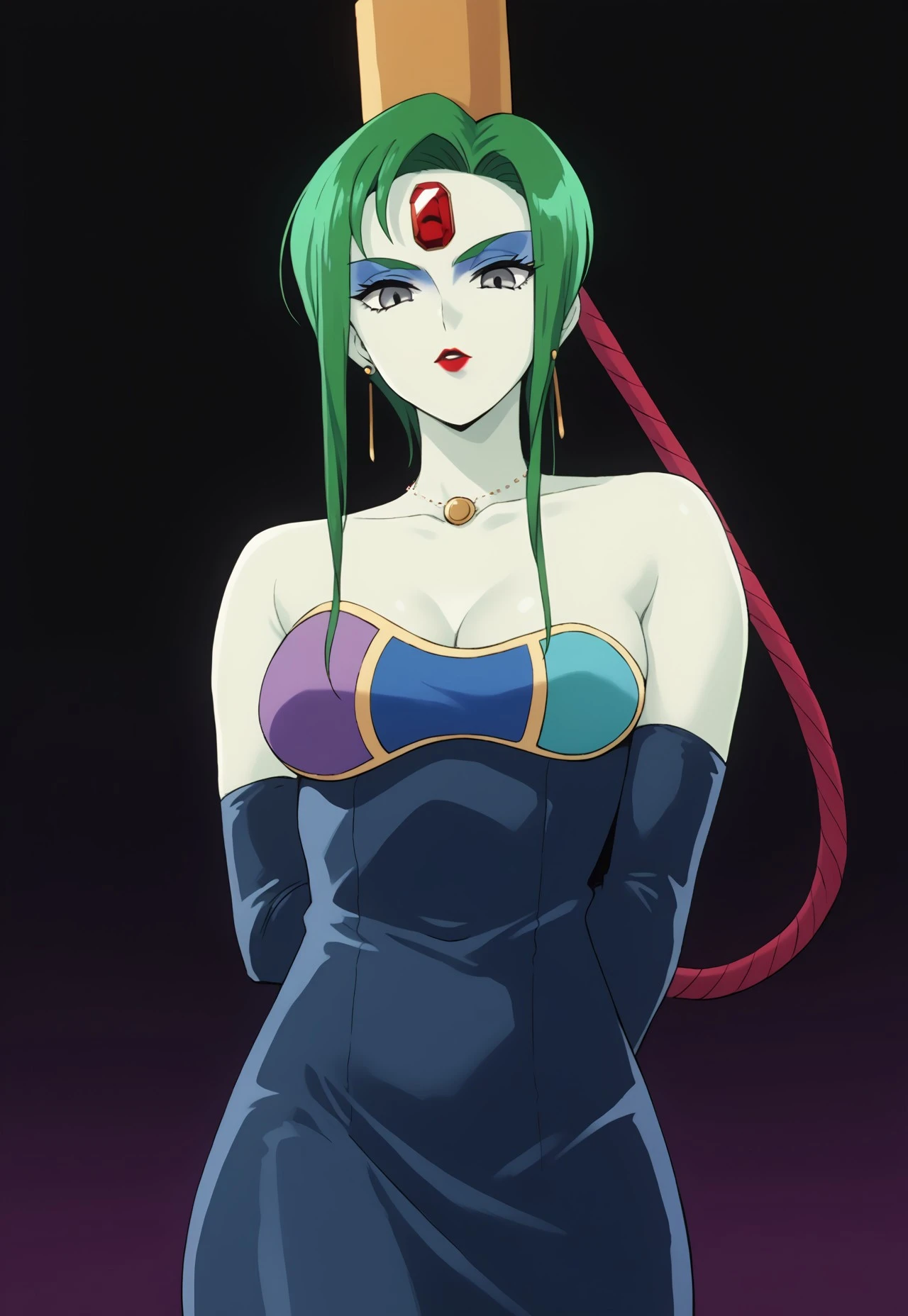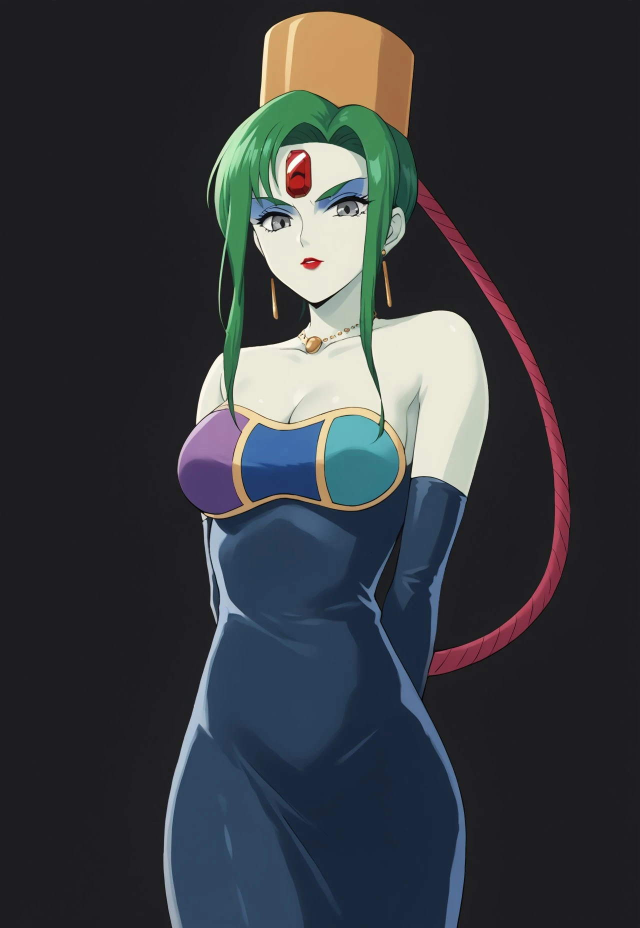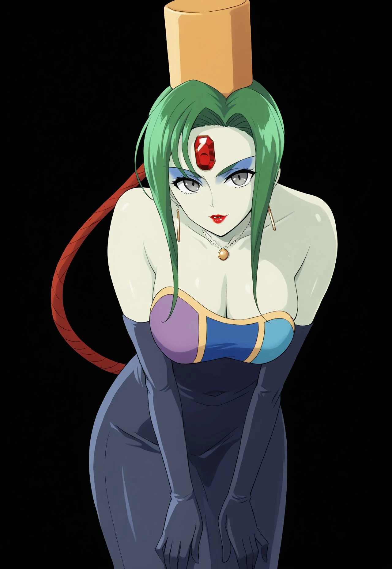 erosatsugessho, green skin, hat, forehead jewel, lipstick, red lips, makeup, earrings, jewelry, necklace, bare shoulders, cleavage, gloves, elbow gloves, dress, strappless dress, pantyhose, green pantyhose, *Insert Here the Prompts of the Other Character*Description