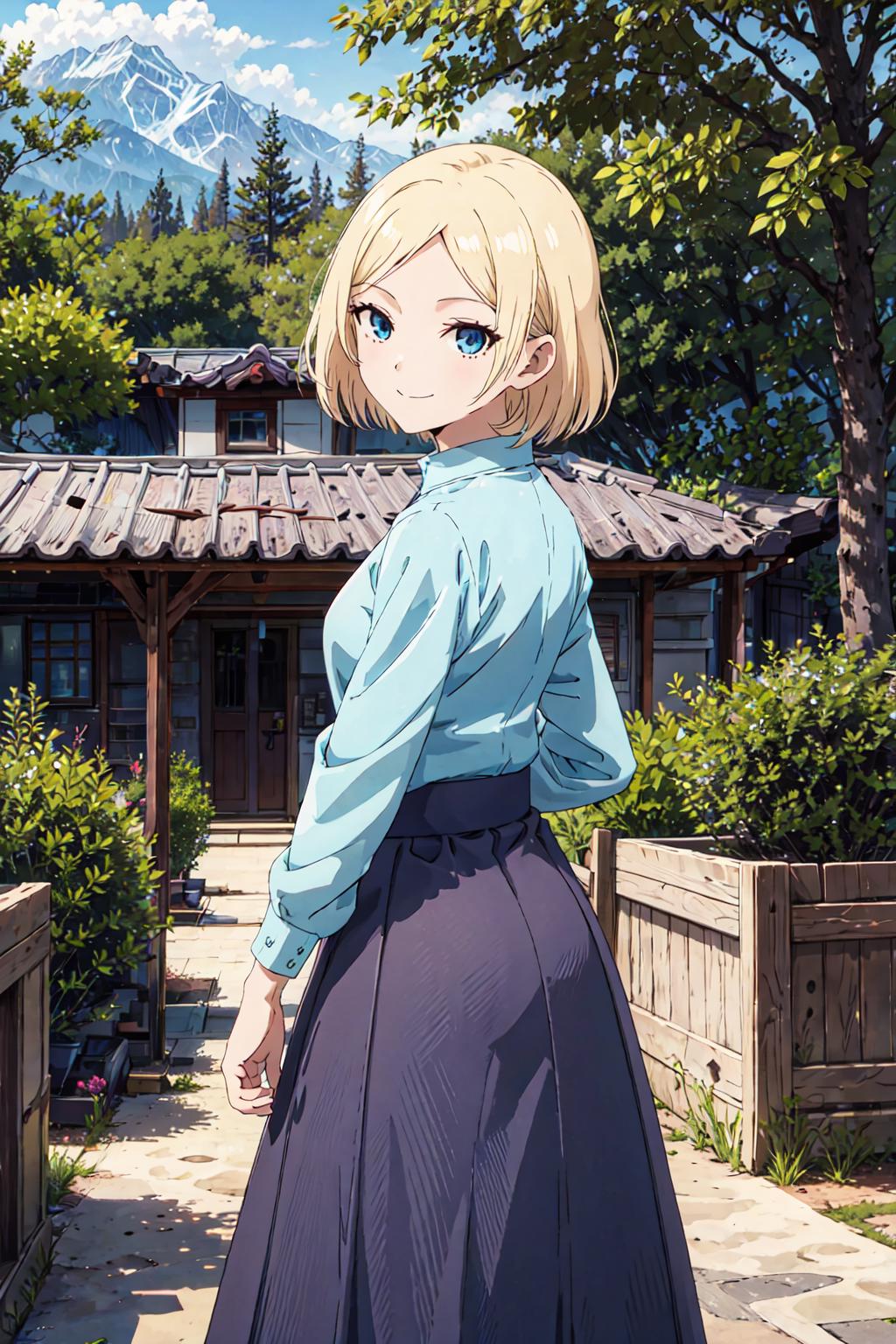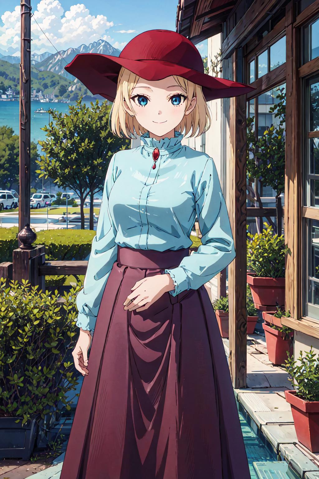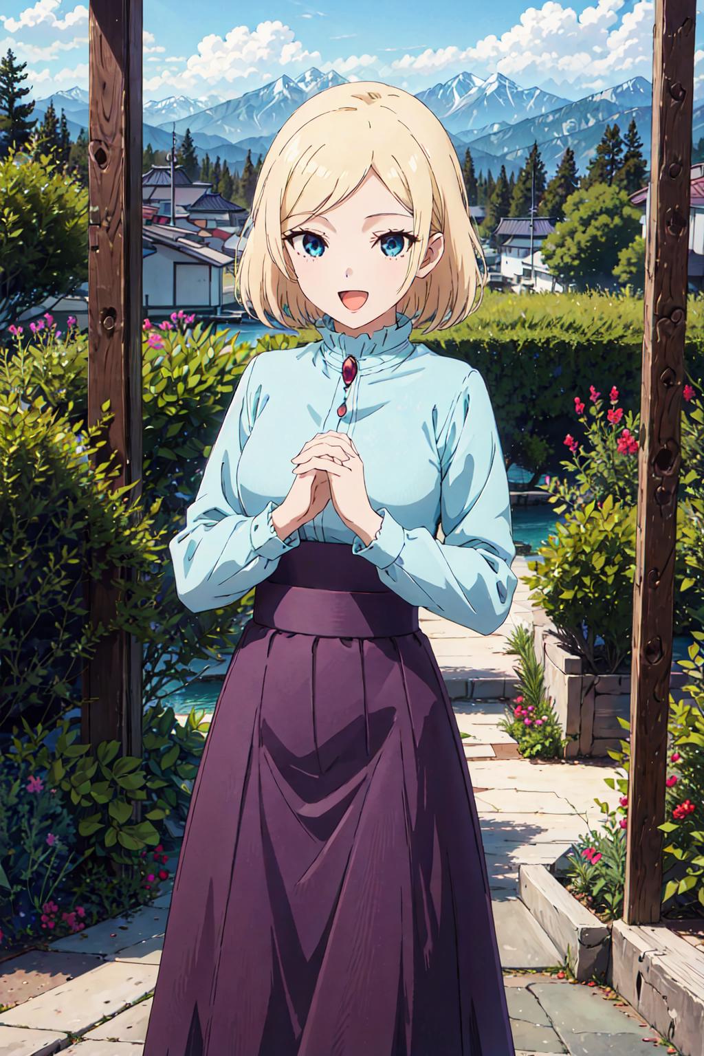 long sleeves, blue shirt, purple skirt, long skirt, ruby broochAdd these if necessary / 需要があれば、これらを加える / 自由選用區: