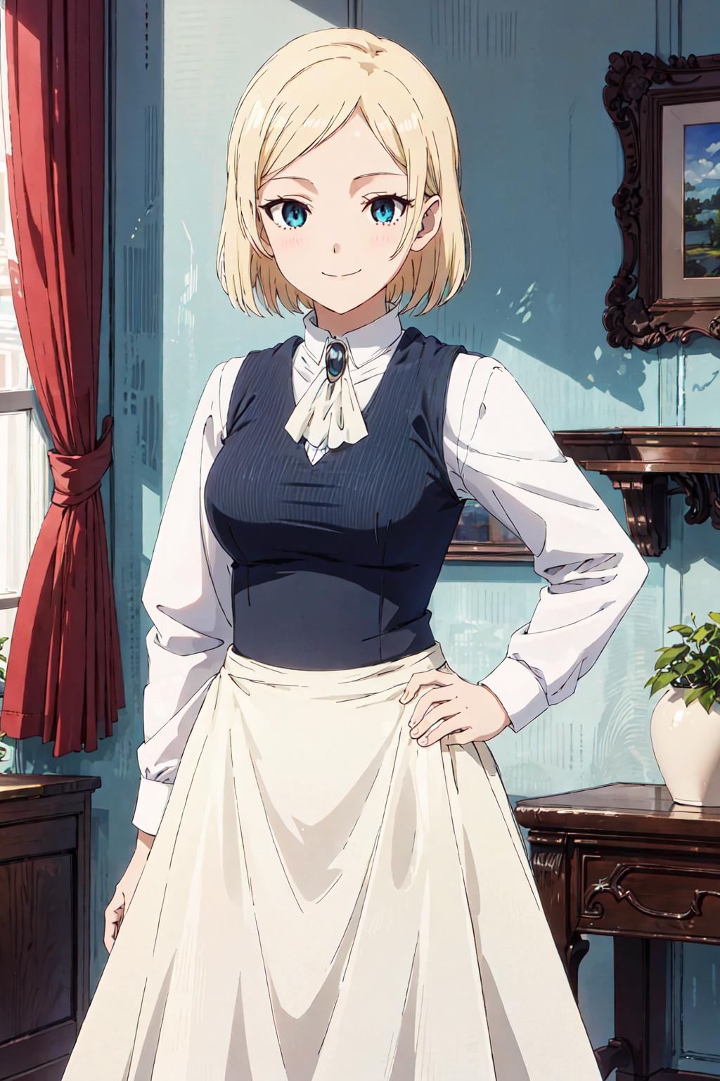 maid, waist apron, black dress, white shirt, white ascot, white apron, vest, blue broochAdd these if necessary / 需要があれば、これらを加える / 自由選用區: