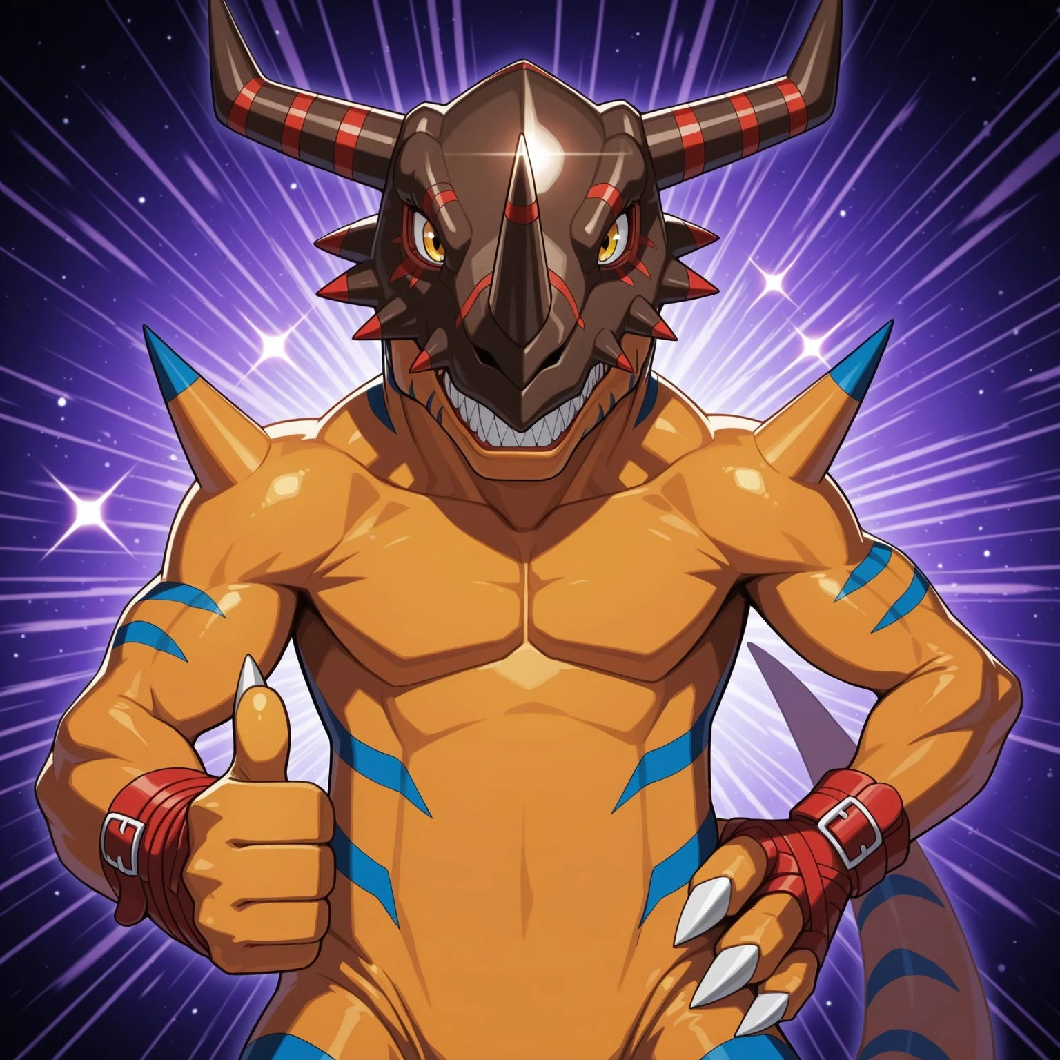 Tags to use: Digimon (creature), reptile, scalie, dinosaur, orange skin, blue stripes, spikes, claws, toe claws, yellow eyes, red bracers, brown and red helmet, horns, three toes, sharp teeth, tail