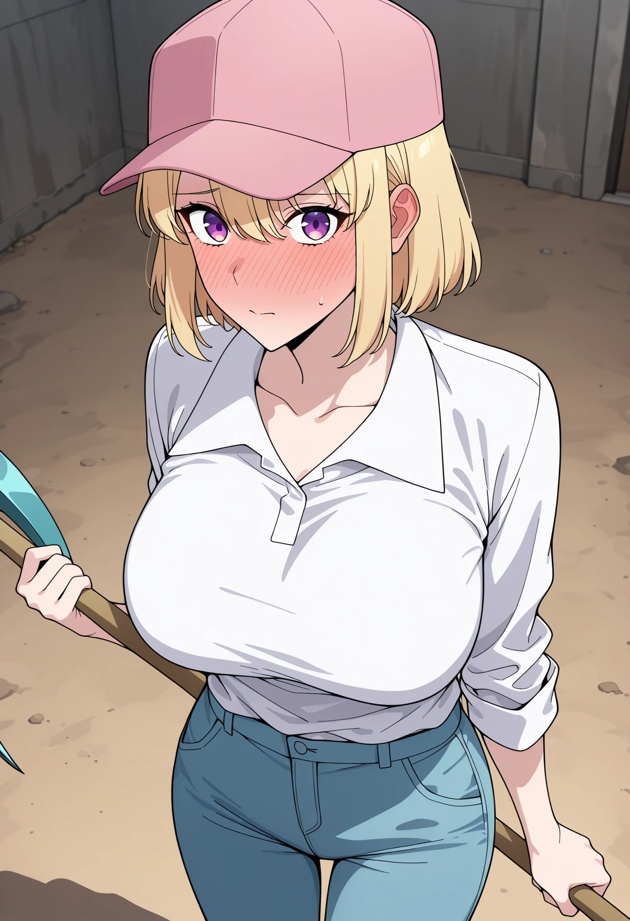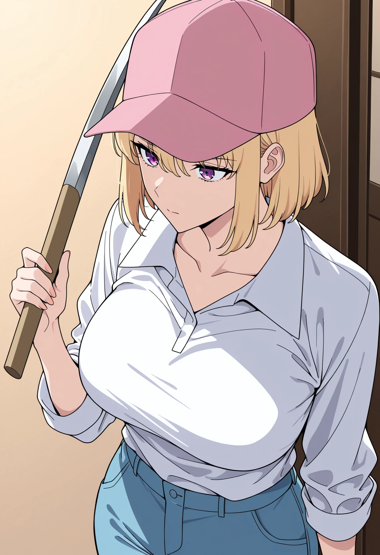 shichaecasual, short hair, blonde hair, hair between eyes, bangs, sidelocks, purple eyes, large breasts, collarbone, white shirt, collared shirt, long sleeves, blue pants, hat, baseball cap, pink headwear,