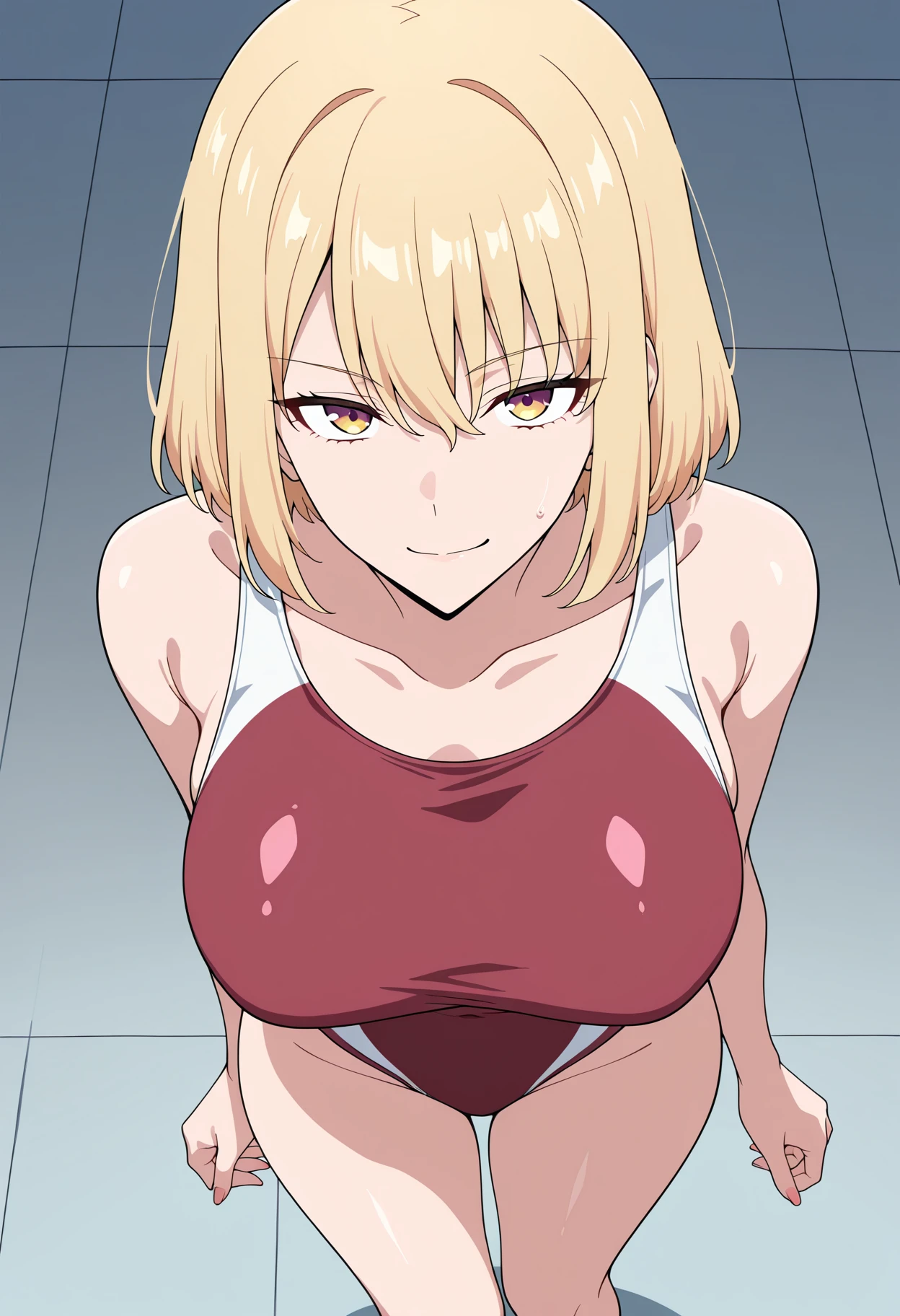 shichaeswim, short hair, blonde hair, hair between eyes, bangs, sidelocks, purple eyes, large breasts, collarbone, red one-piece swimsuit, competition swimsuit, bare legs,