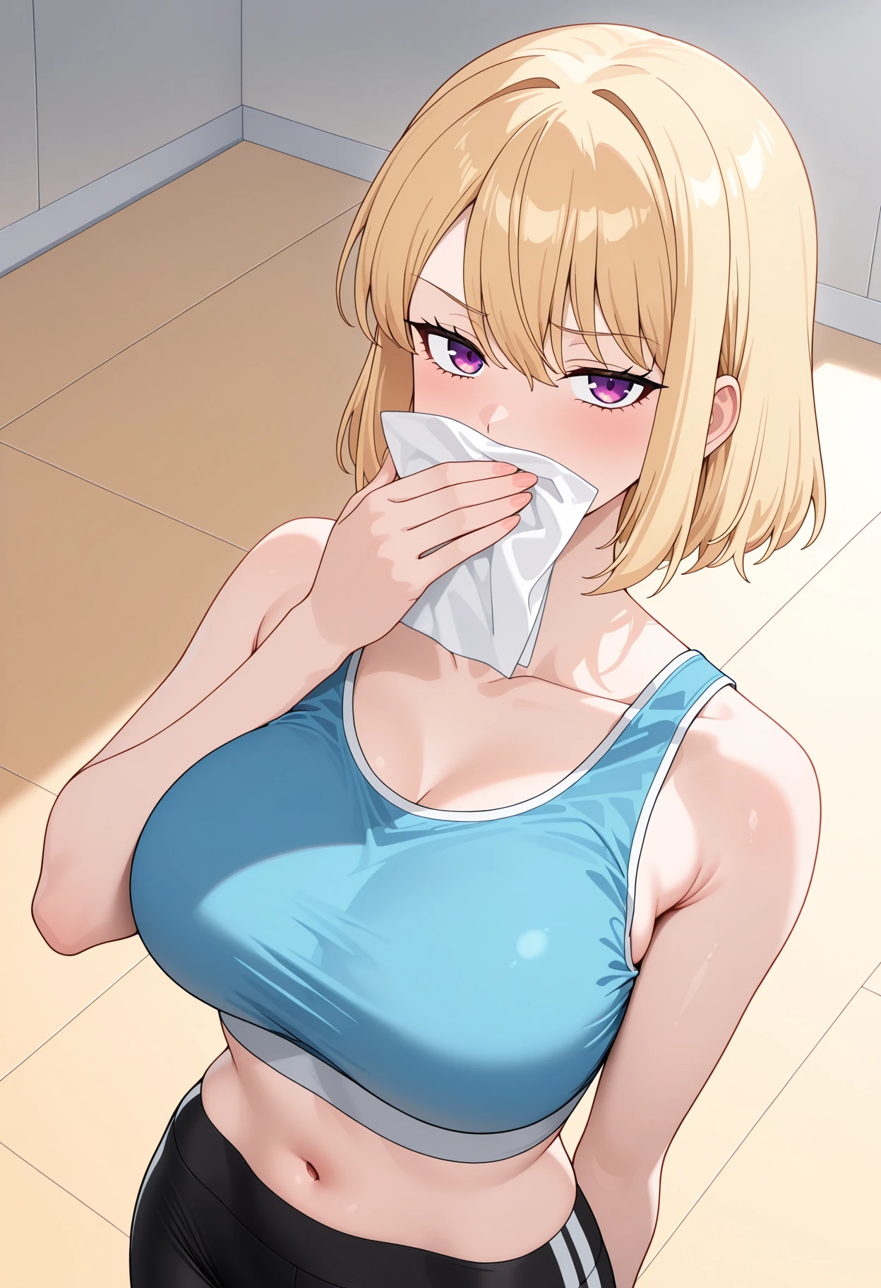 shichaesniff, covering own mouth, holding, holding napkin,Workout outfit Okay need to prompt own pants