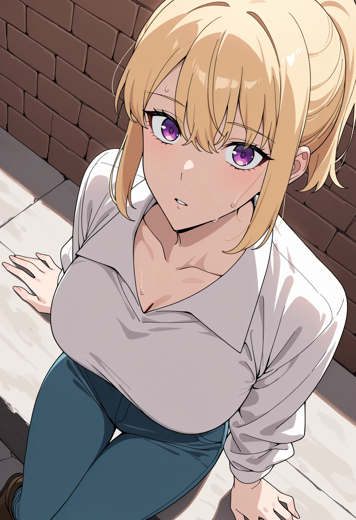 shichaecasual, short hair, blonde hair, hair between eyes, bangs, sidelocks, purple eyes, ponytail, large breasts, collarbone, white shirt, collared shirt, long sleeves, blue pants,
