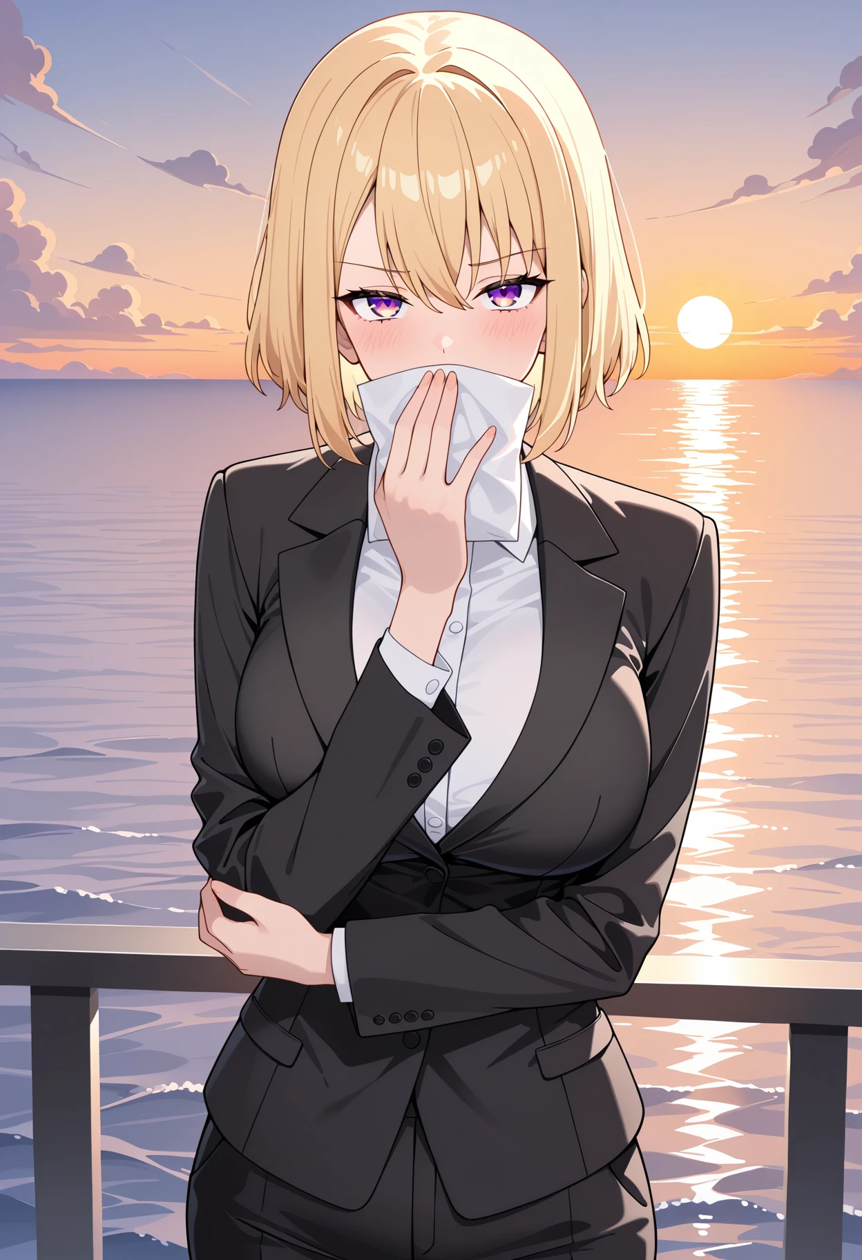 shichaerng, short hair, blonde hair, hair between eyes, bangs, sidelocks, purple eyes, large breasts,