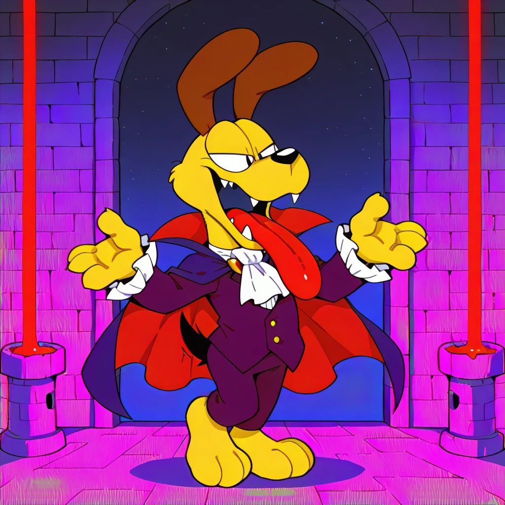 male, solo, tall, yellow fur, large brown ears, black nose, white sclera, black eyes, slim black tail, paws, two large fangs, black suit with long sleeves, white ascot, white ruffled ascot, large black cape with red lining, large red tongue, thick red tongue,