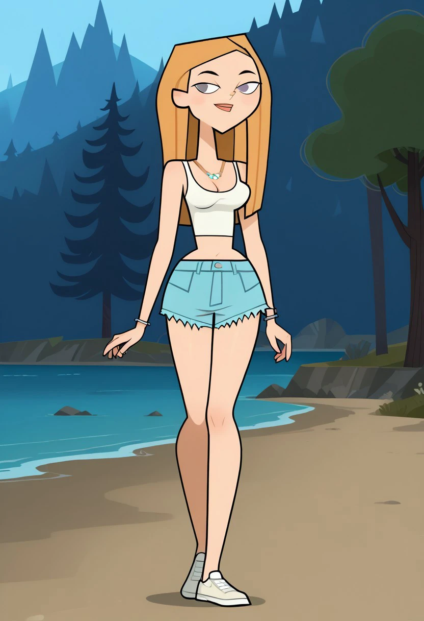 julia, tdreboot, blonde hair, lips, jewelry, necklace, bracelets, white tanktop, denim shorts, white sneakers