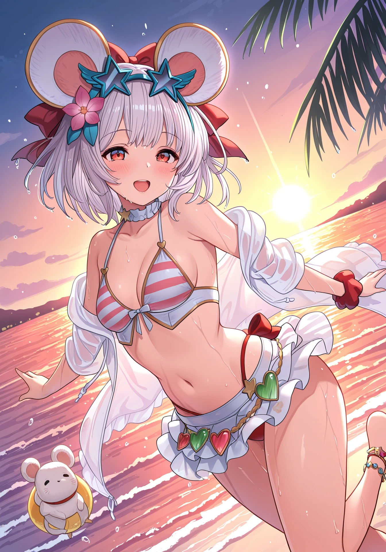 vikalaWallflower, see-through jacket, open jacket, striped bikini top, red highleg bikini, white bikini skirt, pink hair flower, red hair bow, sunglasses, eyewear on head, white frilled choker, red wrist scrunchie, red bridal garter, anklet, bare shoulders
