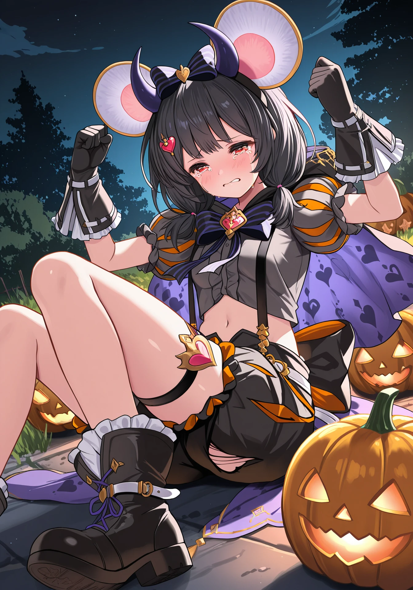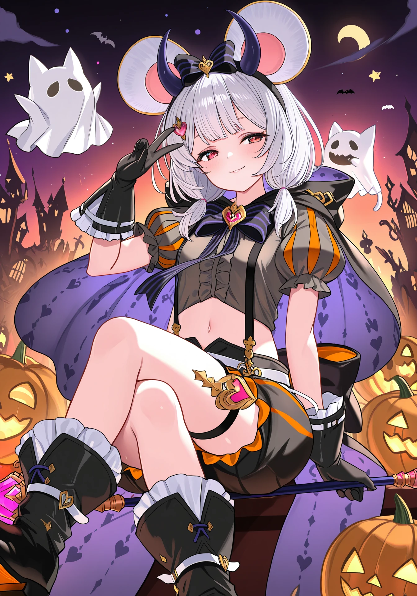 vikalaHalloween, grey midriff, black puffy shorts, hooded cape, black footwear, fake horns, heart hair ornament, puffy short sleeves, black striped hair bow, black striped bowtie, suspenders, black gloves, thigh strap, low twintails