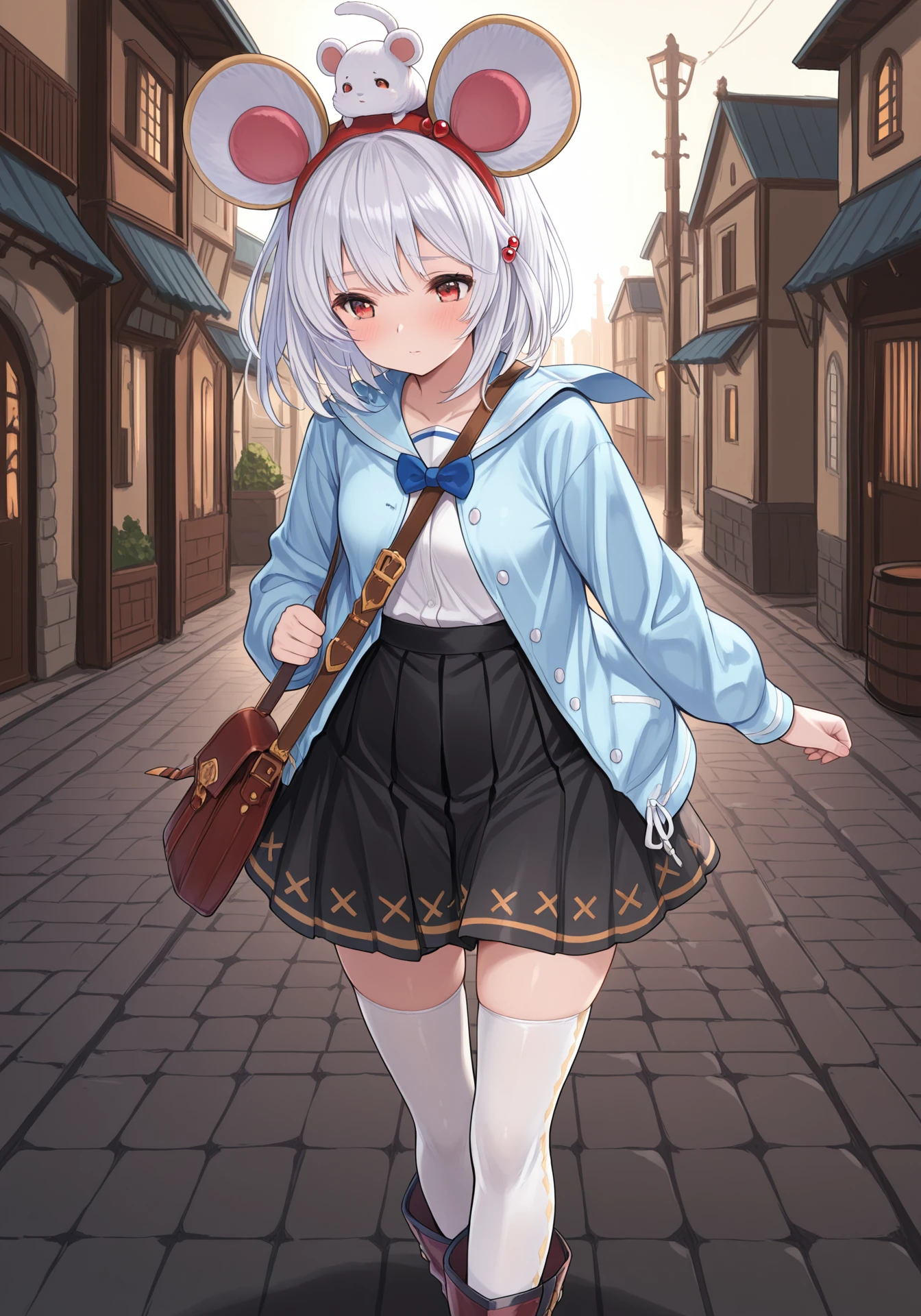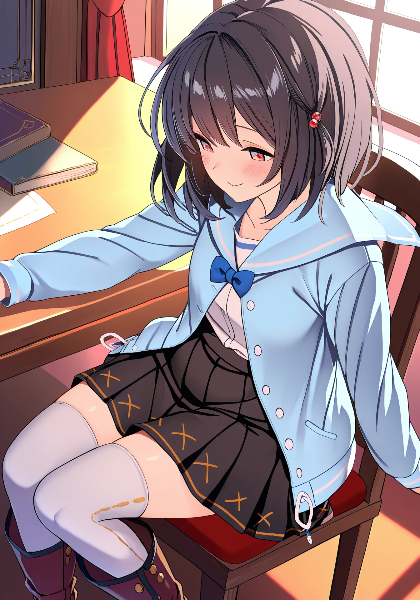 vikalaEvent, blue jacket, blue sailor collar, black skirt, blue bowtie, white thighhighs, red hair bobbles, brown boots