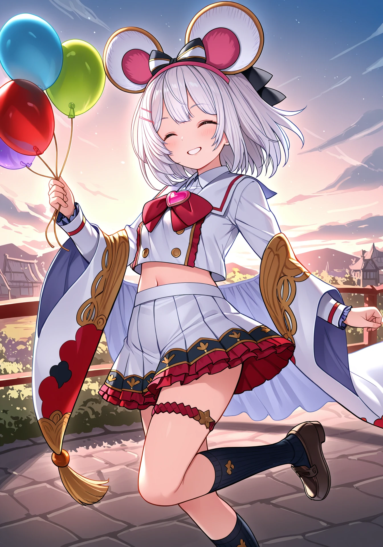 vikalaDefault, white midriff, crop top overhang, frilled miniskirt, red bowtie, detached wide sleeves, pink hairclip, heart brooch, red thigh strap, black socks, brown loafers, black and white hair bow