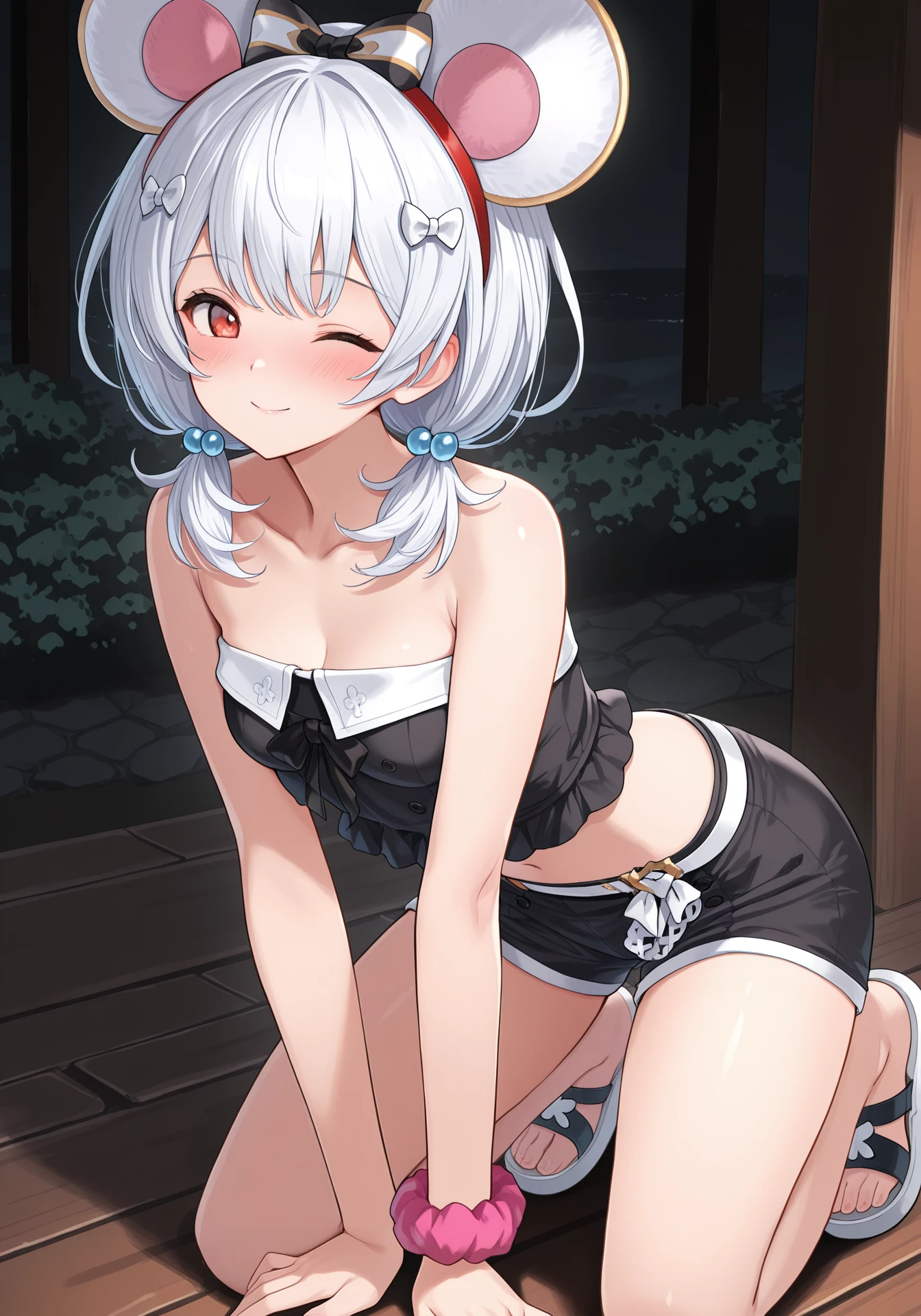 v1kala, white hair, red eyes, short hair, small breasts, fake animal ears, mouse ears, hairband