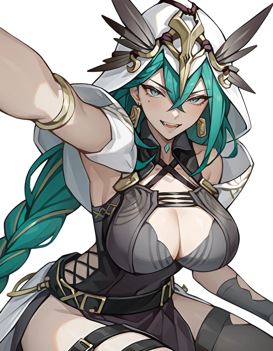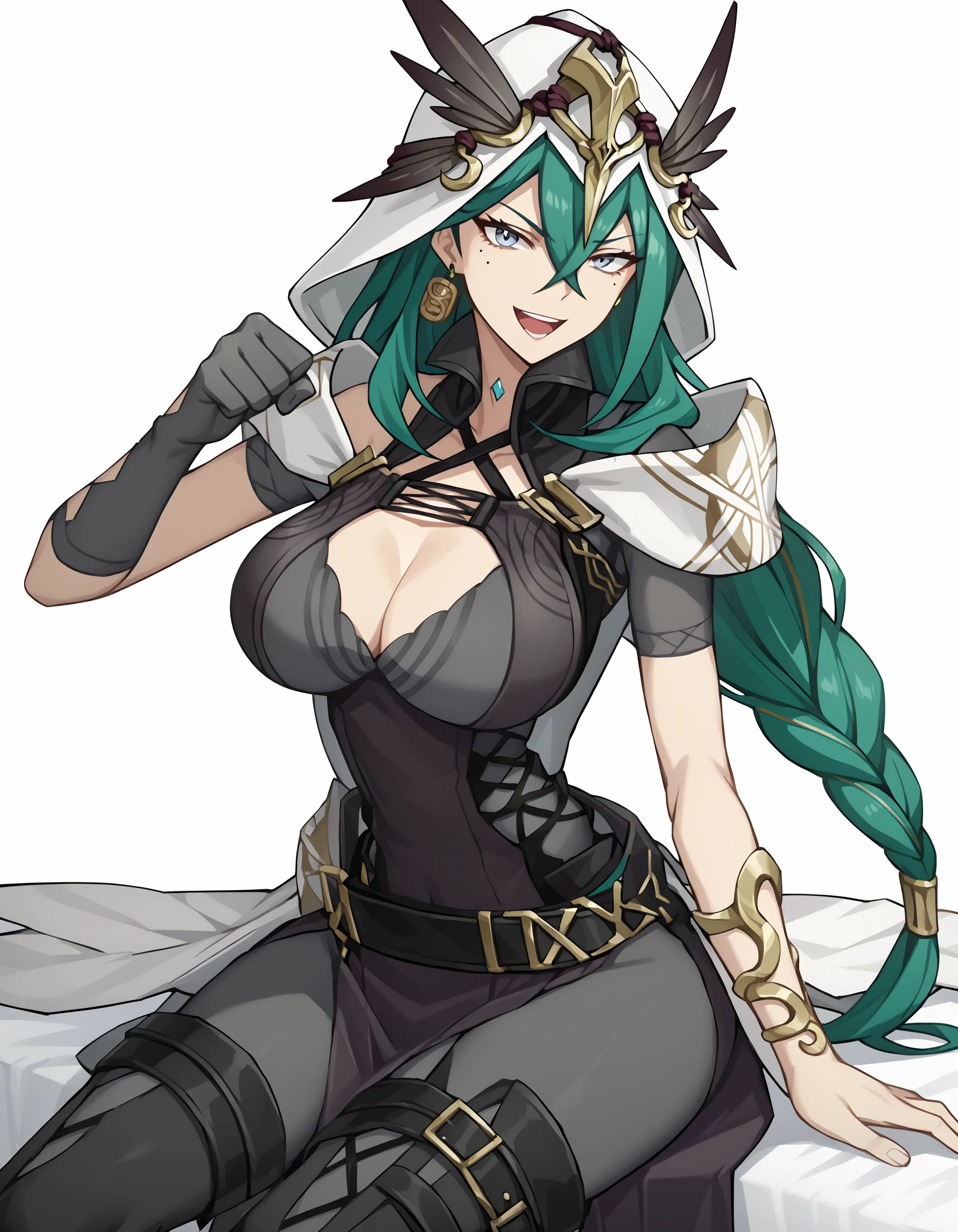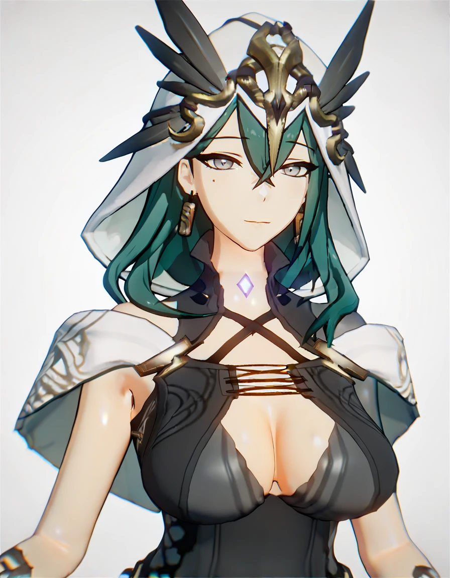 lilinuo,1girl,solo,breasts,mole,long hair,mole under eye,large breasts,cleavage,braid,jewelry,green hair,earrings,dress,belt,hair between eyes,bangs,single glove,black dress,grey eyes,Description