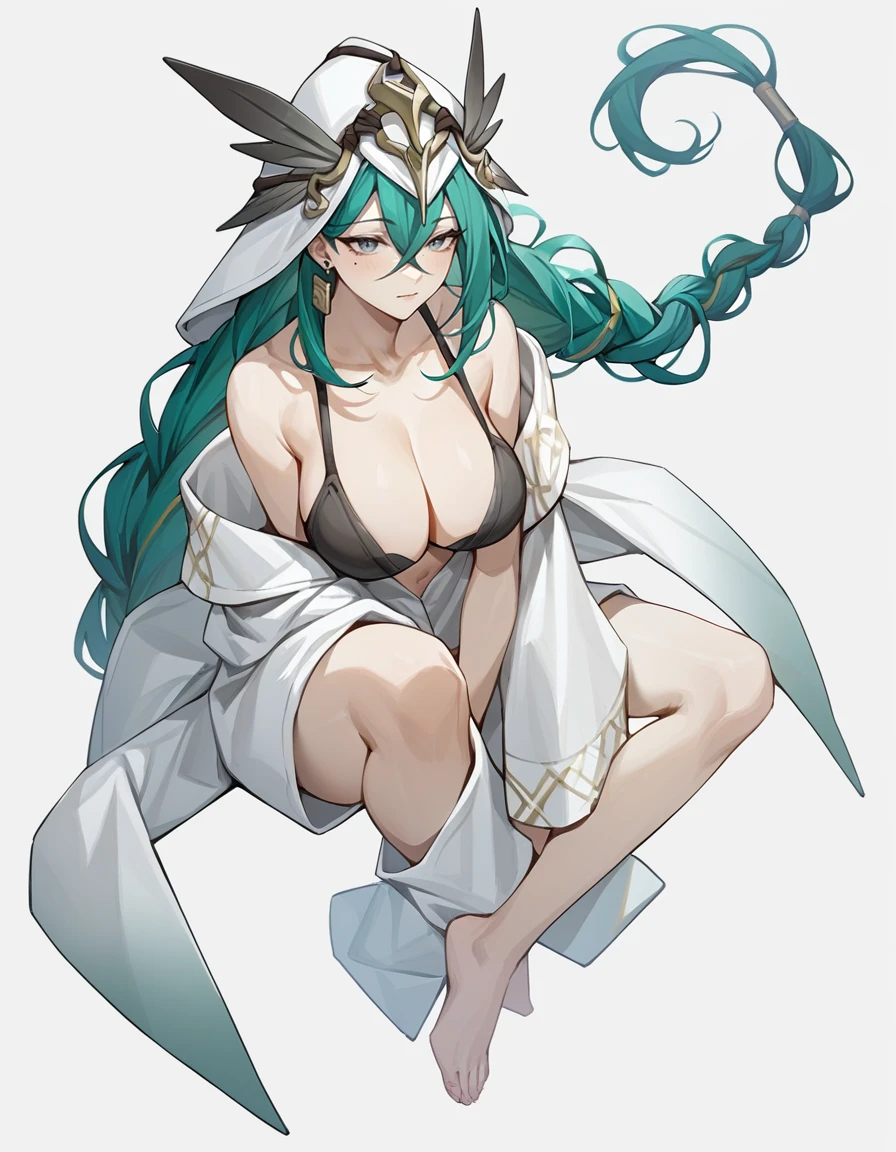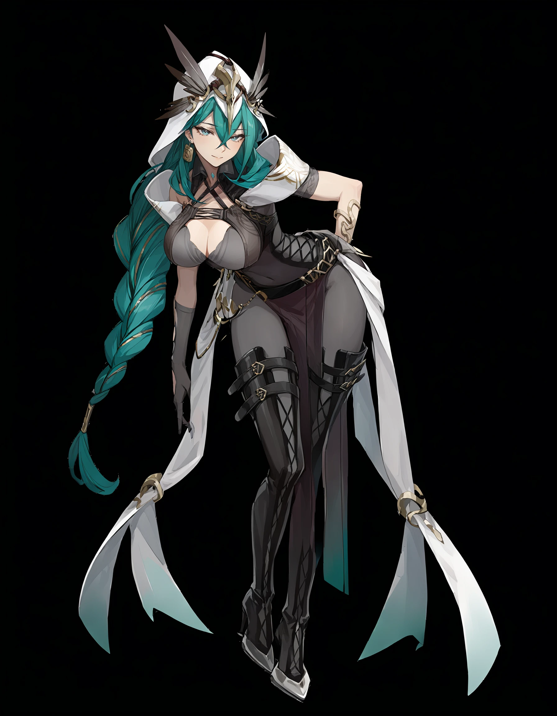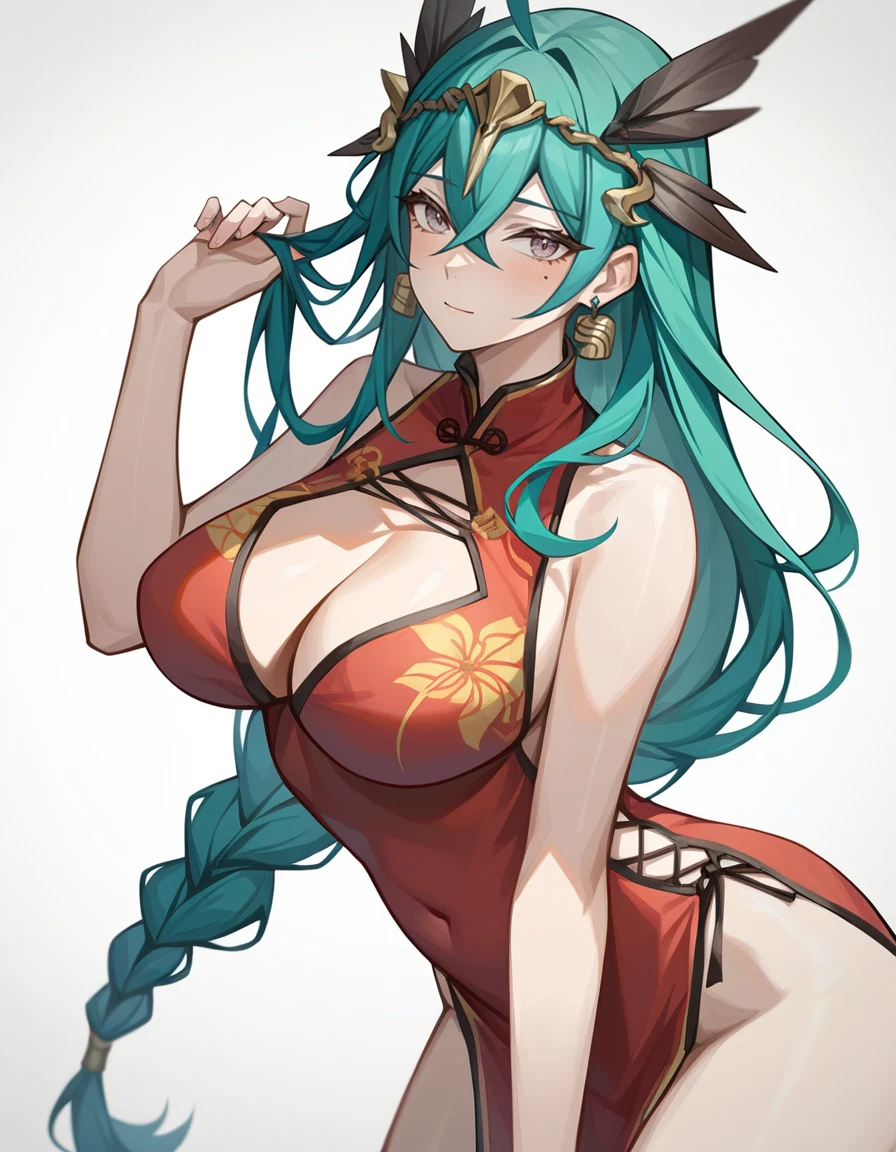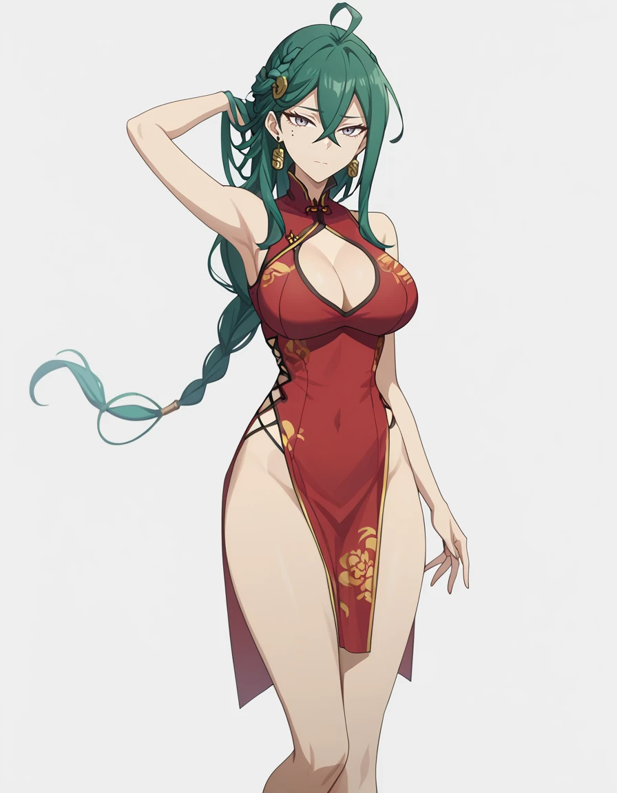 lilinuo,1girl,solo,breasts,mole,long hair,mole under eye,large breasts,cleavage,braid,jewelry,green hair,earrings,dress,belt,hair between eyes,bangs,single glove,black dress,grey eyes,Description