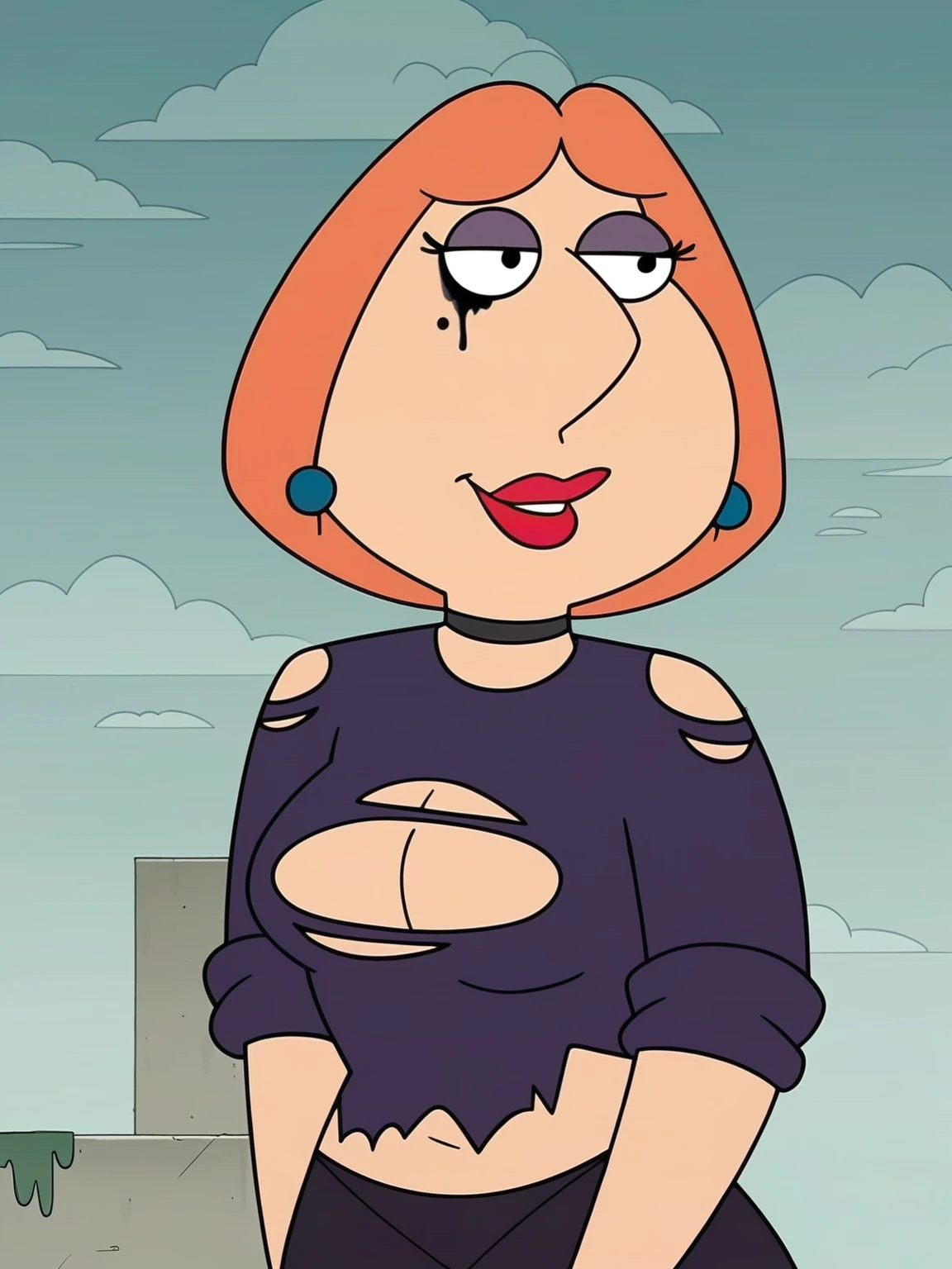 Recommend prompt: "lo_s, 1girl, bright orange hair, bob hair, black eyes, big pointy triangular nose, blue pearl earrings, red lipstick"