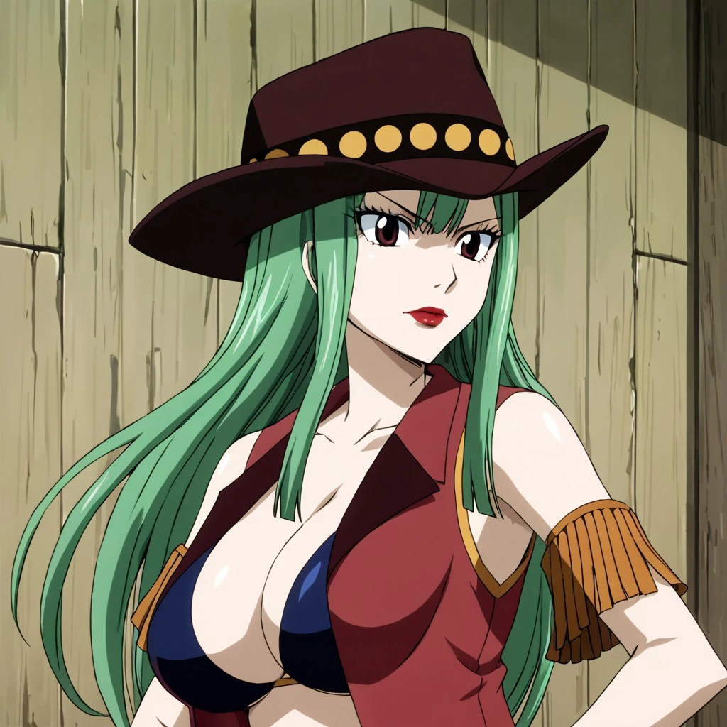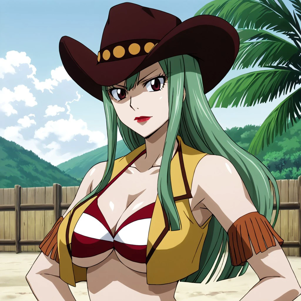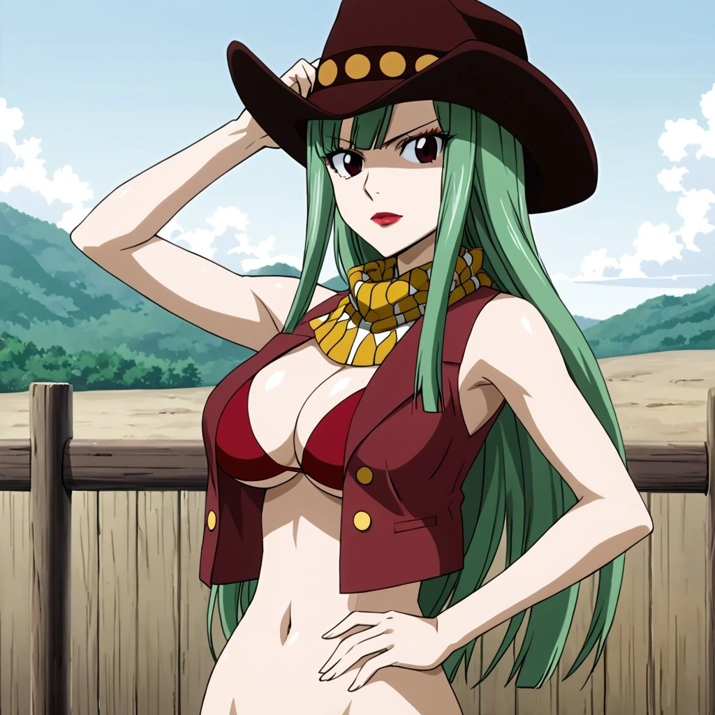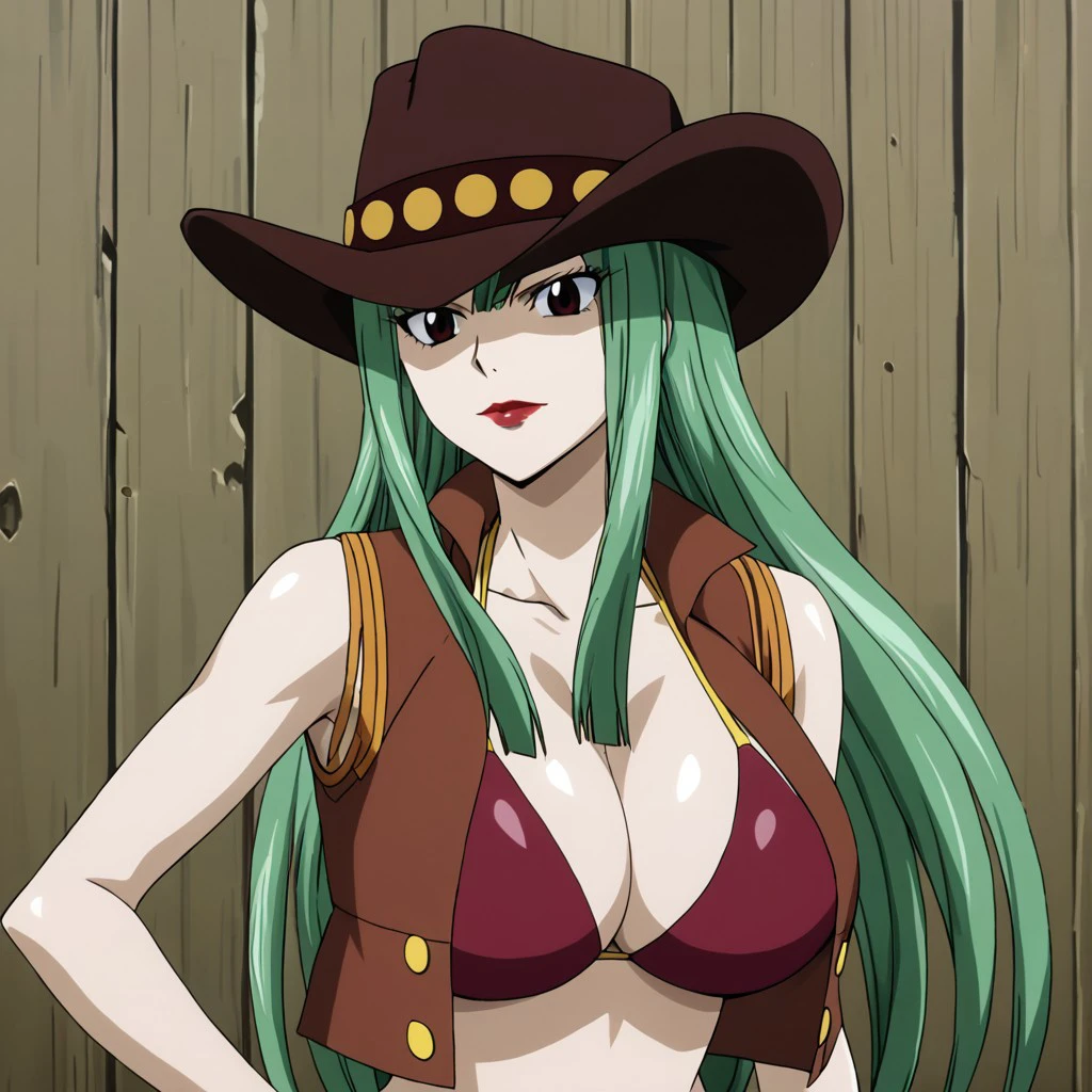 bisca, braid, green Hair, long Hair, makeup, red lips, red eyes, Big breast, wide hips, miniskirt, bikini top only, vest, cowboy hat,