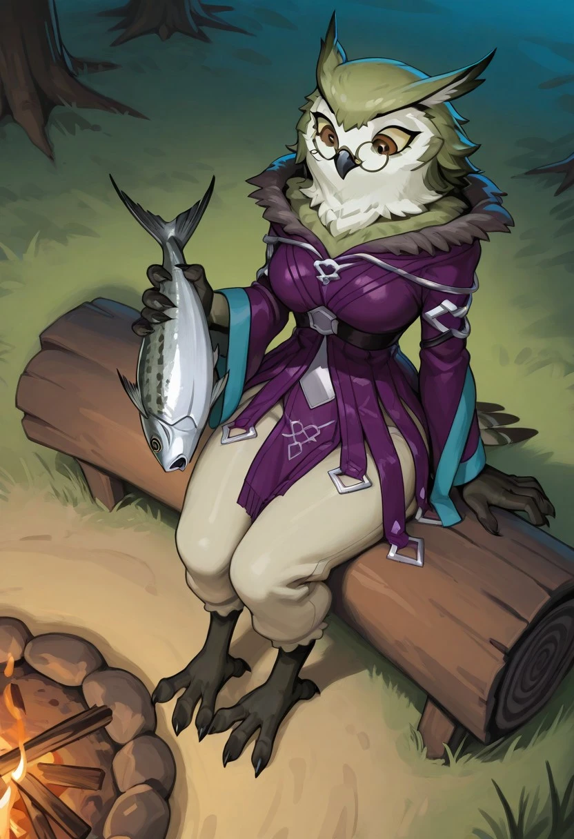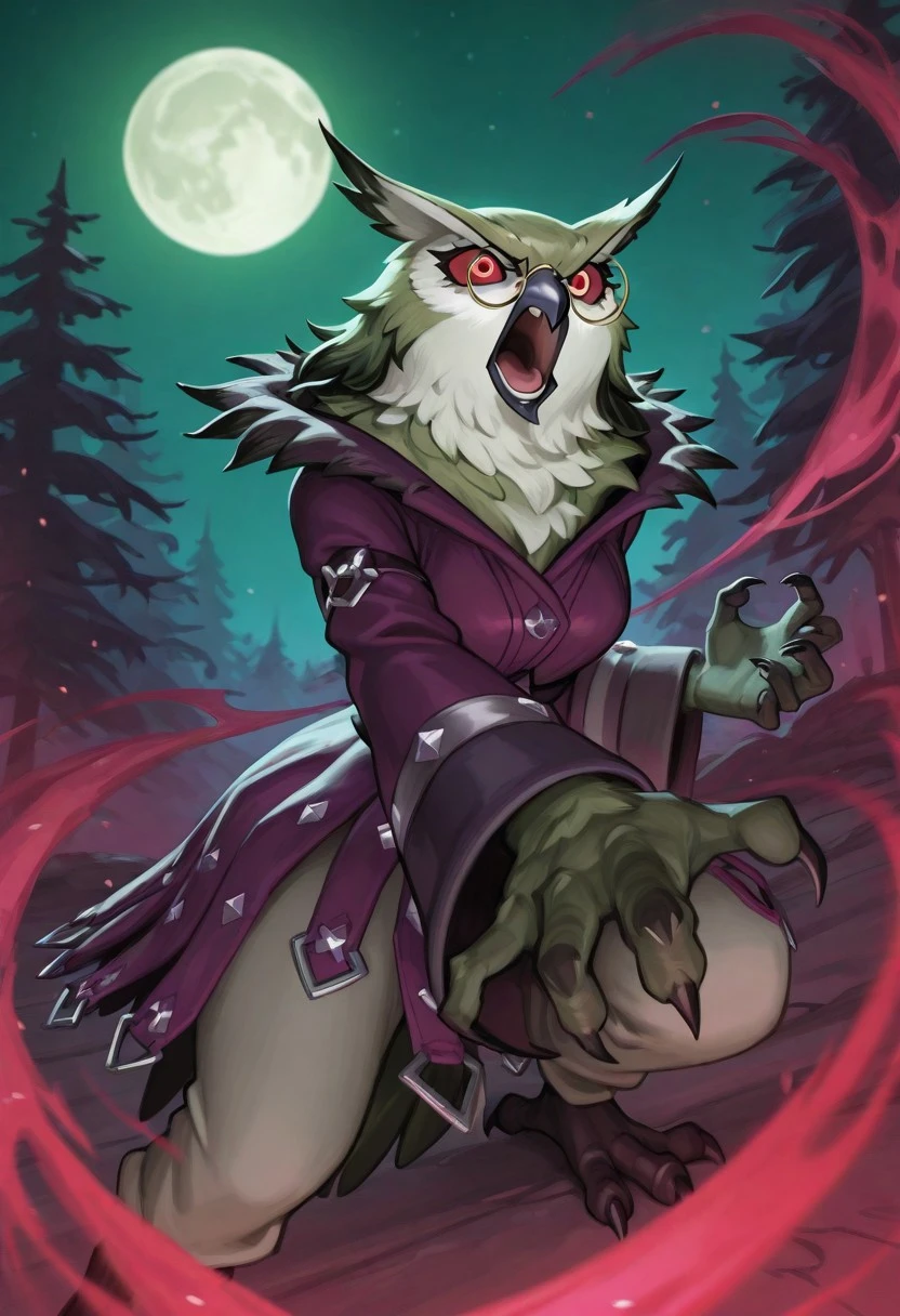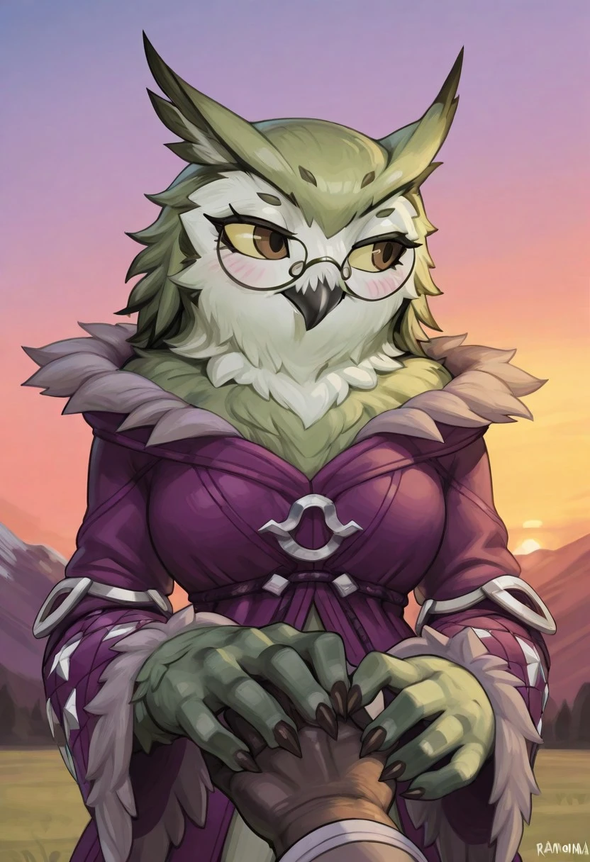 owl head, owl, anthro, brown eyes, yellow sclera, small beak, green and white fur,