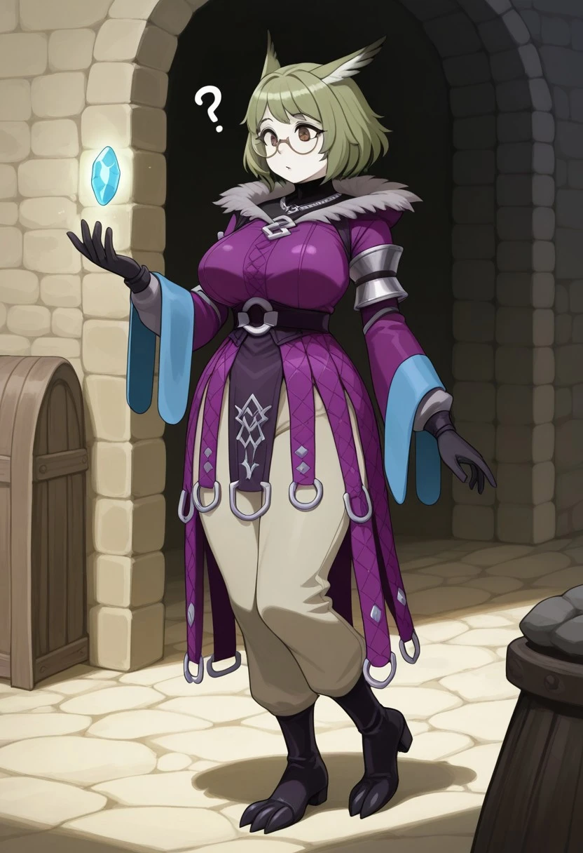 small round glasses, coat, blue stoles, blue drapes, claws, pelvic curtain, beige pants, black talons,