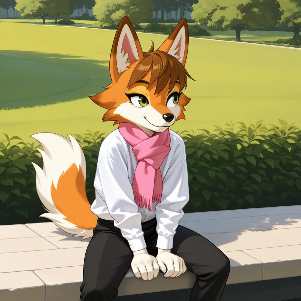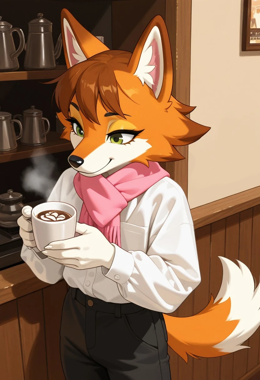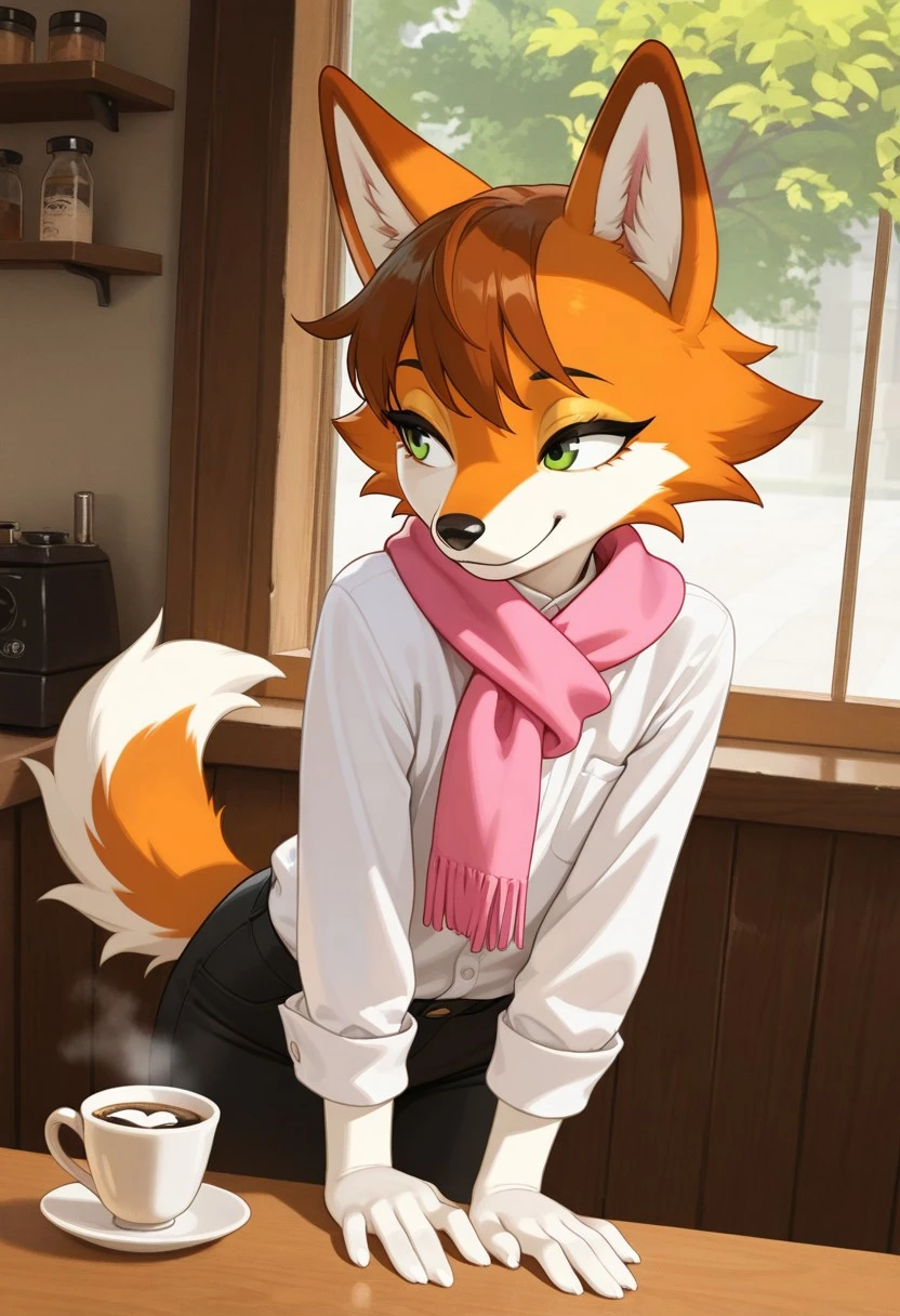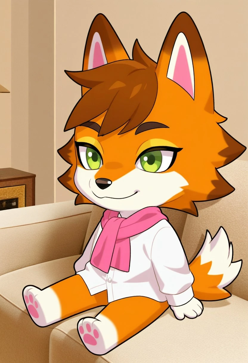 ChiefAC,chibi,anthro, furry,wolf,male,solo, Orange fur,white muzzle,white hands,white paws,Fluffy Orange tail,white tail tip, sly green eyes, tuft of Brown hair, pink scarf over white shirt,yellow eyeshadow,Black eyebrows
