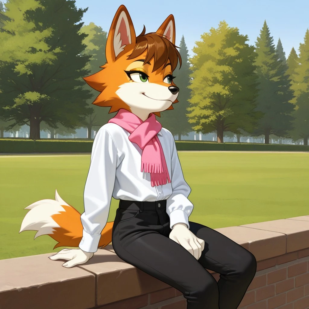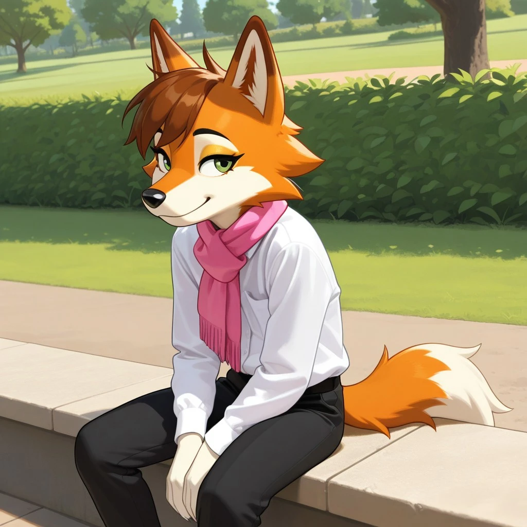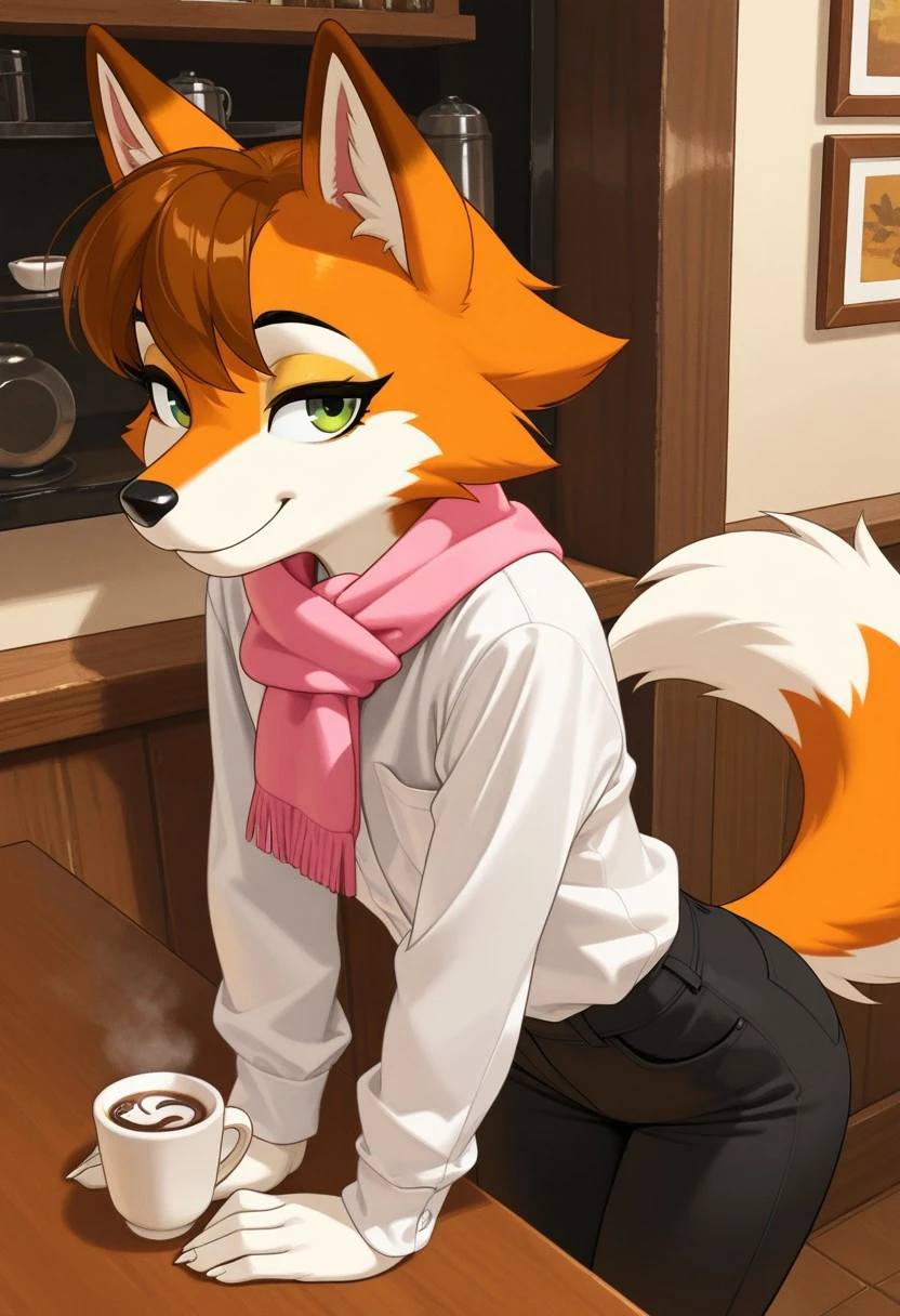 ChiefAC,chibi,anthro, furry,wolf,male,solo, Orange fur,white muzzle,white hands,white paws,Fluffy Orange tail,white tail tip, sly green eyes, tuft of Brown hair, pink scarf over white shirt,yellow eyeshadow,Black eyebrows