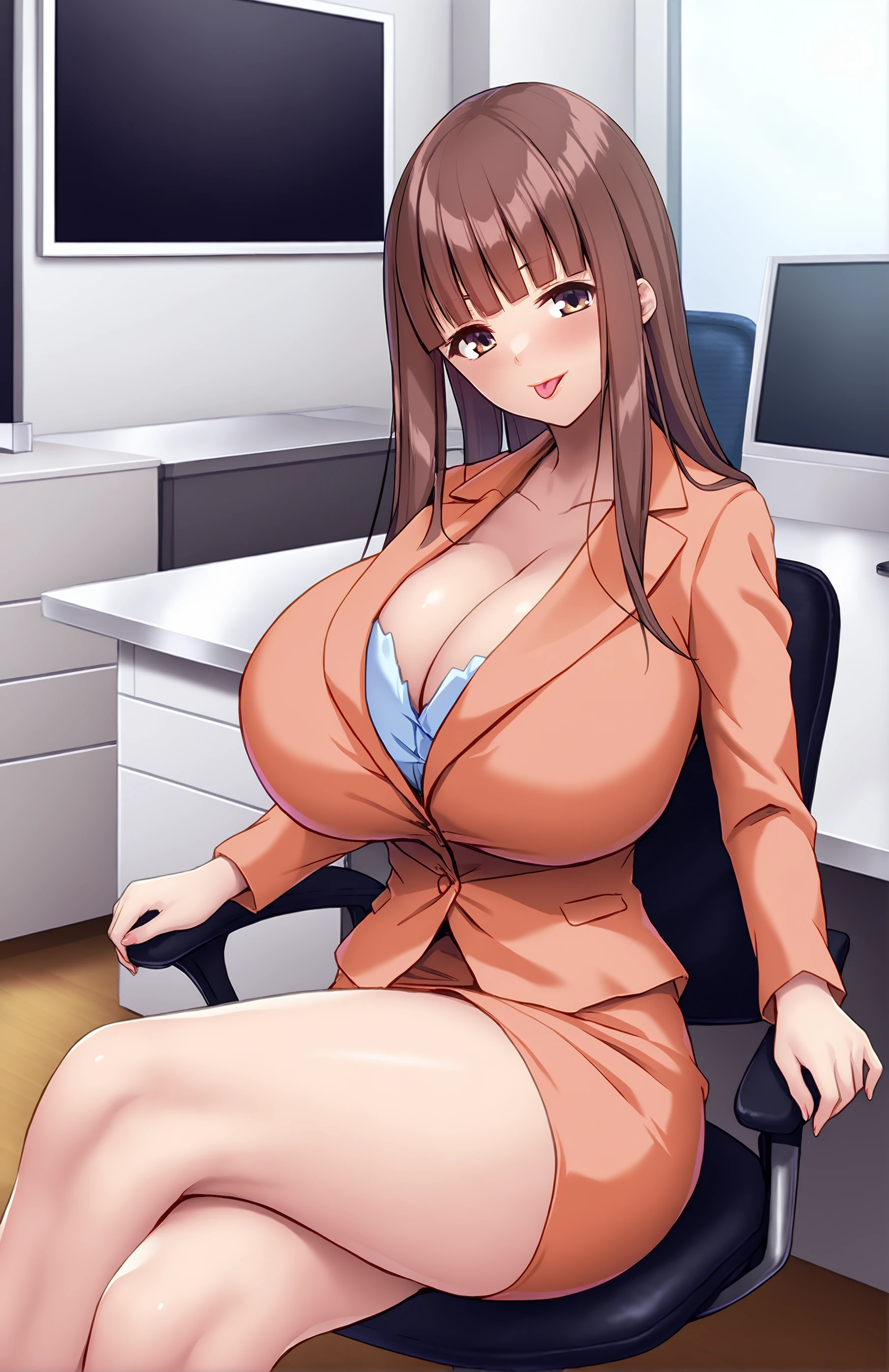 TsurumaIsami, long hair, breasts, bangs, skirt, brown hair, shirt, long sleeves, cleavage, collarbone, jacket, brown eyes, blunt bangs, huge breasts, suit, pencil skirt, orange skirt, orange jacket, suit