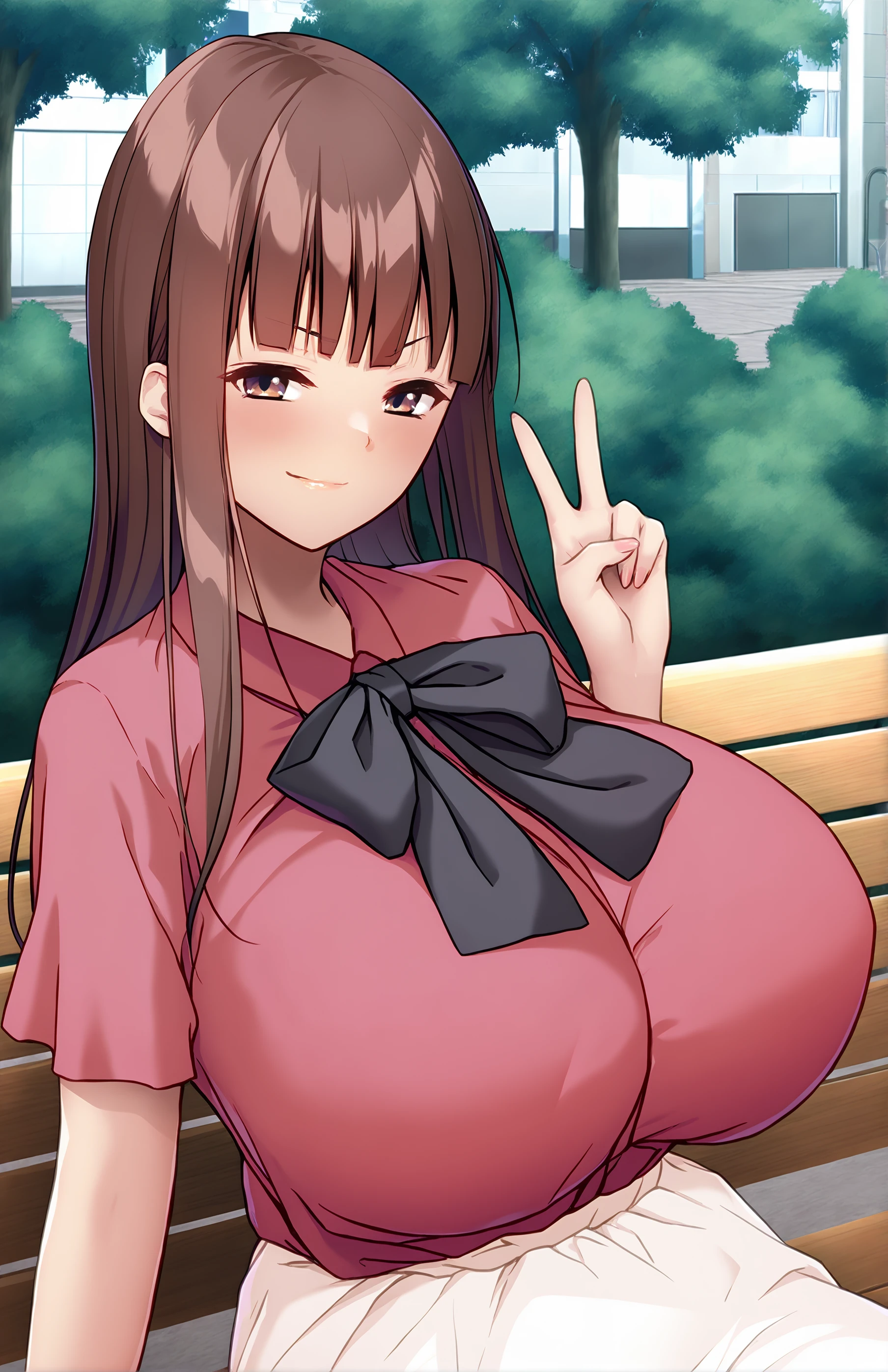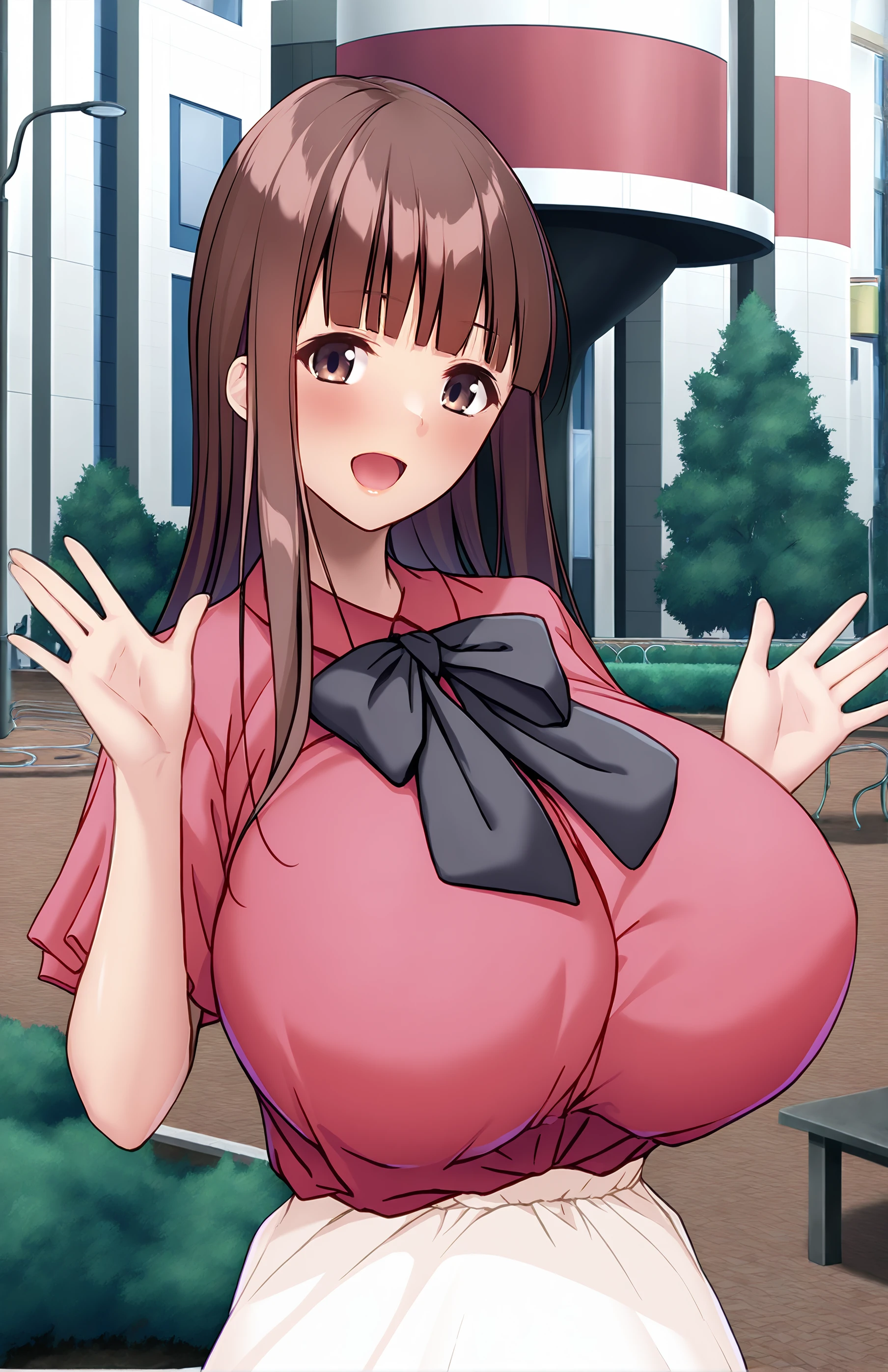 TsurumaIsami, long hair, breasts, bangs, skirt, brown hair, shirt, bow, brown eyes, short sleeves, blunt bangs, bowtie, huge breasts, black bow, white skirt, red shirt, black bowtie