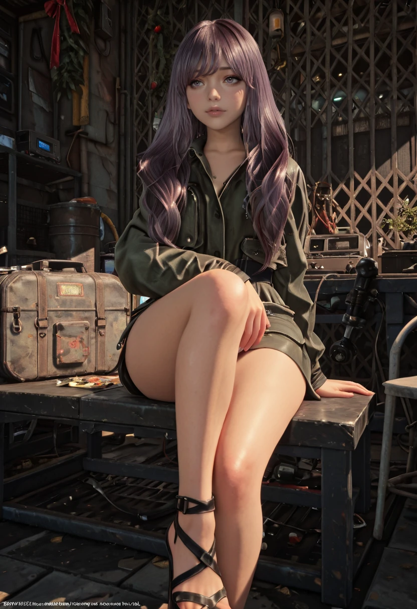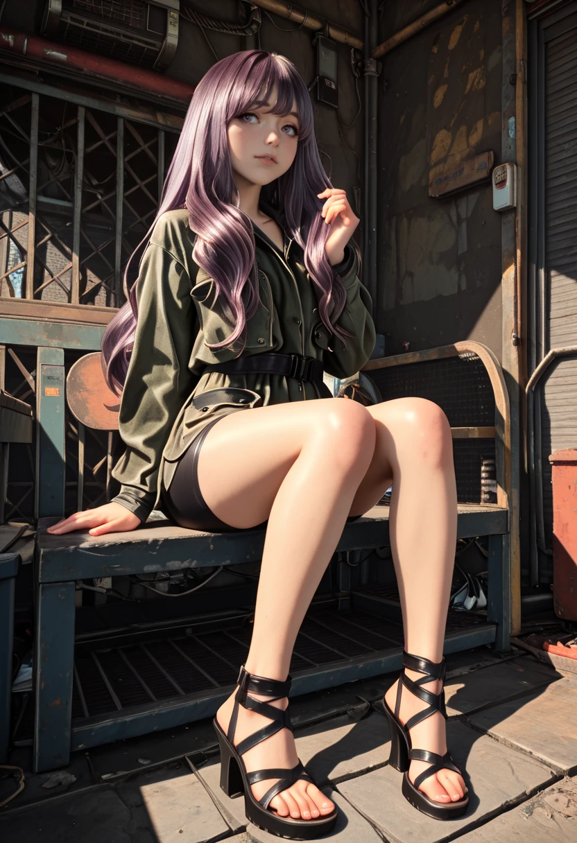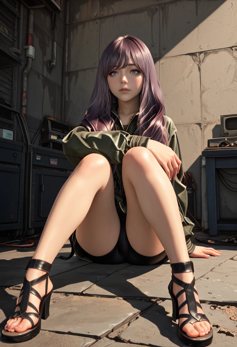 kaya, long hair, purple hair, jacket, long sleeves, pocket, green jacket, sandals, high heels, toes, shorts, bike shorts