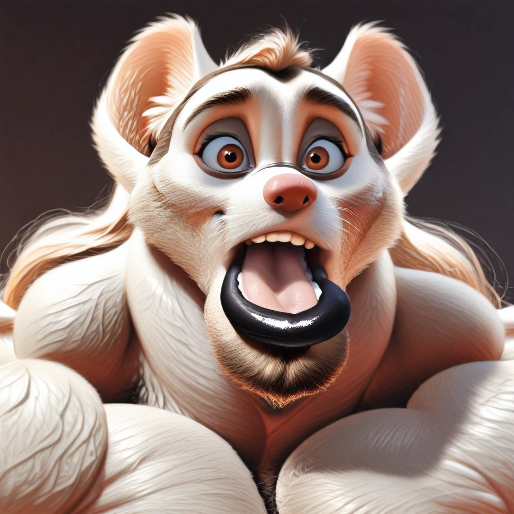 furry, anthro, animal focused, furr-focused, animal ears, big chin, cheekbones, big lip, black lip, huge lip, giant bottom lip, long hair, hair covering one eye, muscular, bara, hyper muscular, hyper muscles, hyper masculine, chin goatee, goatee, sideburns, muttonchops,
