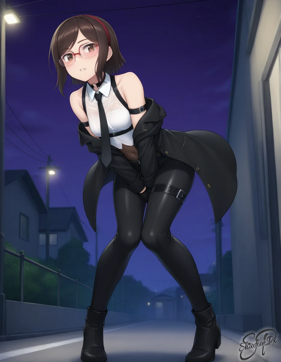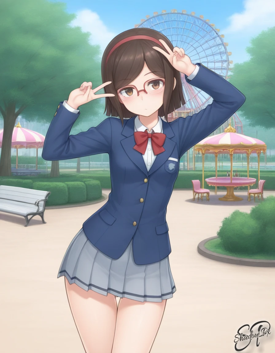 k0us4k4Ch1n4, 1girl, short hair, brown hair, brown eyes, hairband, glasses, semi-rimless eyewear, over-rim eyewear, red-framed eyewear, small breasts,