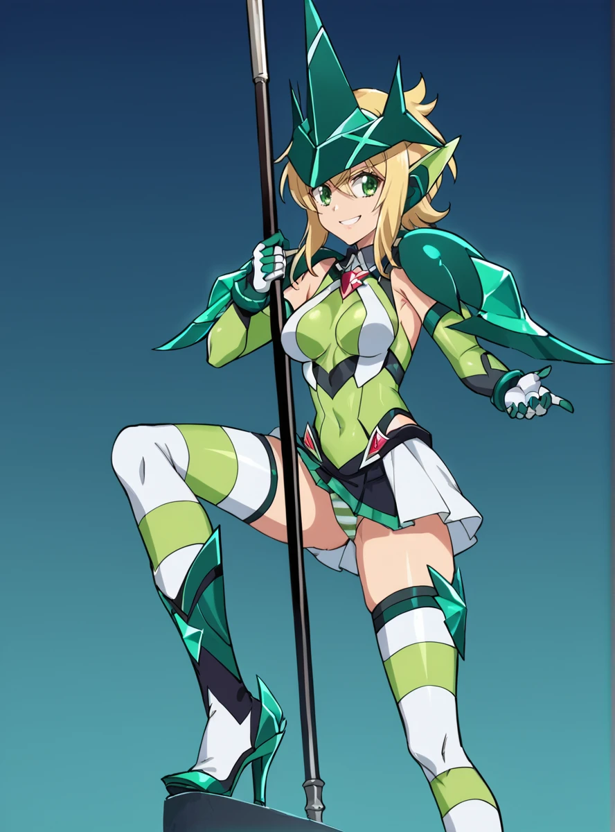 Igalima Gear: leotard, armor, shoulder armor, striped thighhighs, headgear, smile, skirt, gloves high heels,