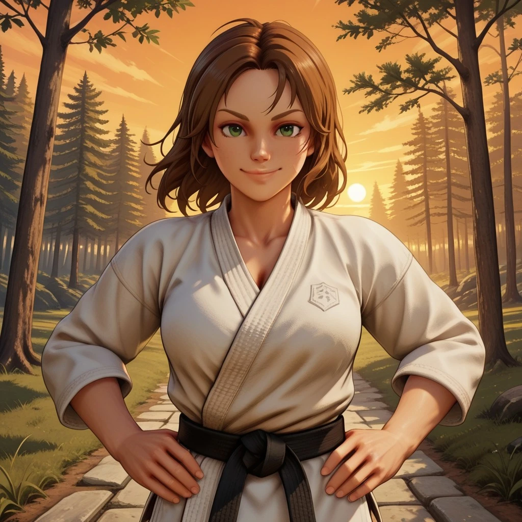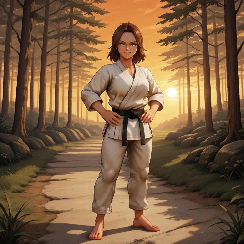UrsulaOC, 1girl, brown hair, short hair, green hair, karate outfit, white karate gi, black belt, barefoot