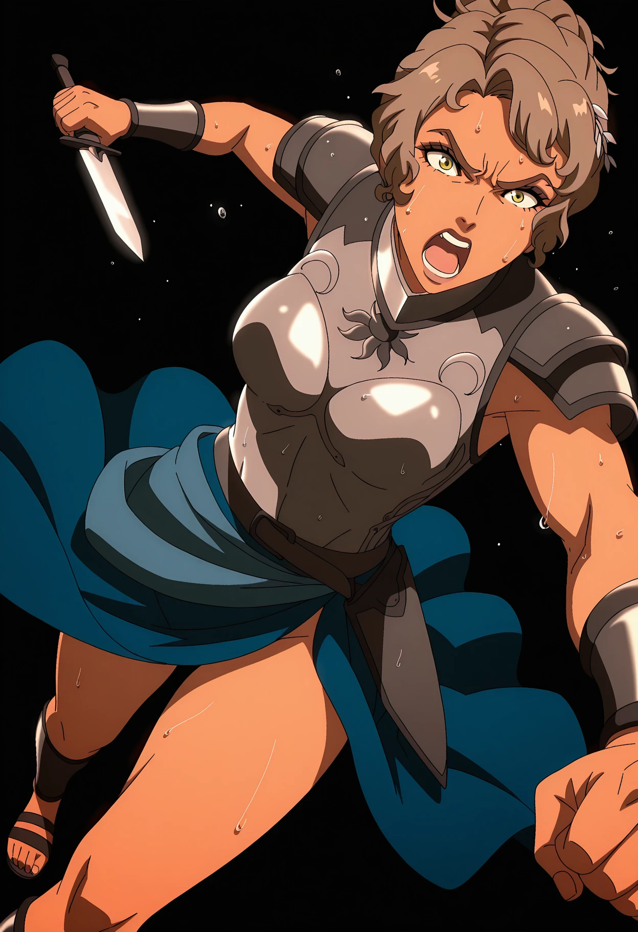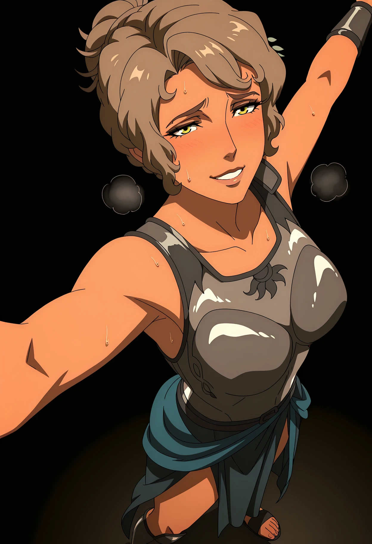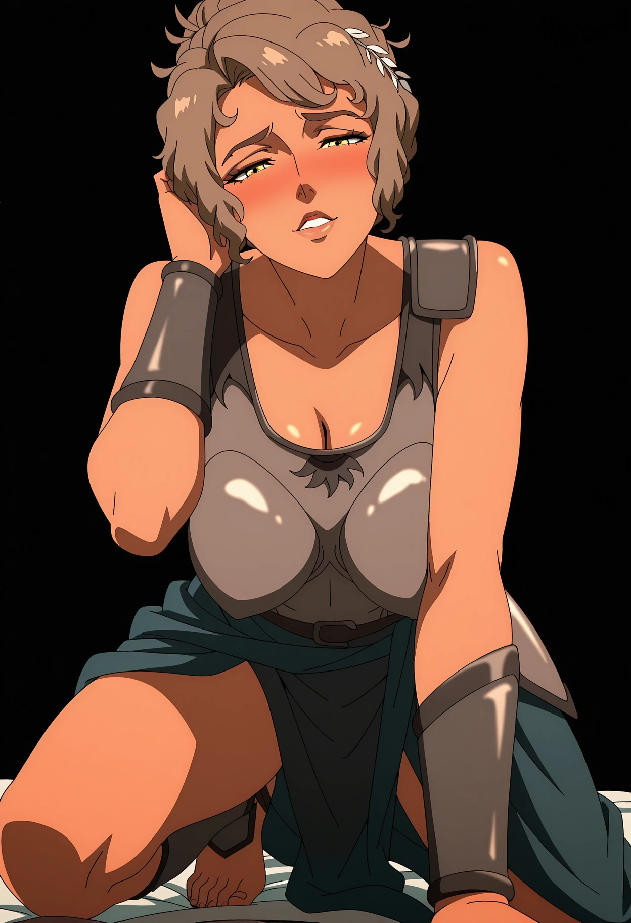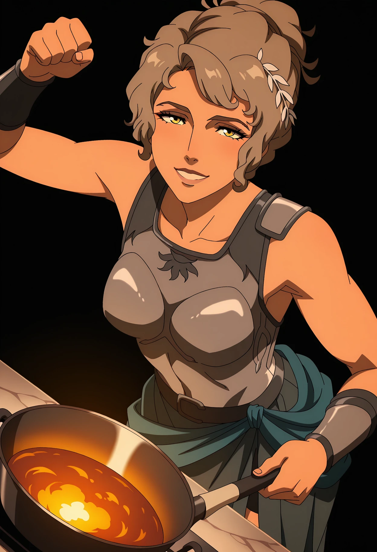 1girl, athena, mature female, dark-skinned female, short hair, brown hair, single hair bun, yellow eyes, lips, breasts, muscular