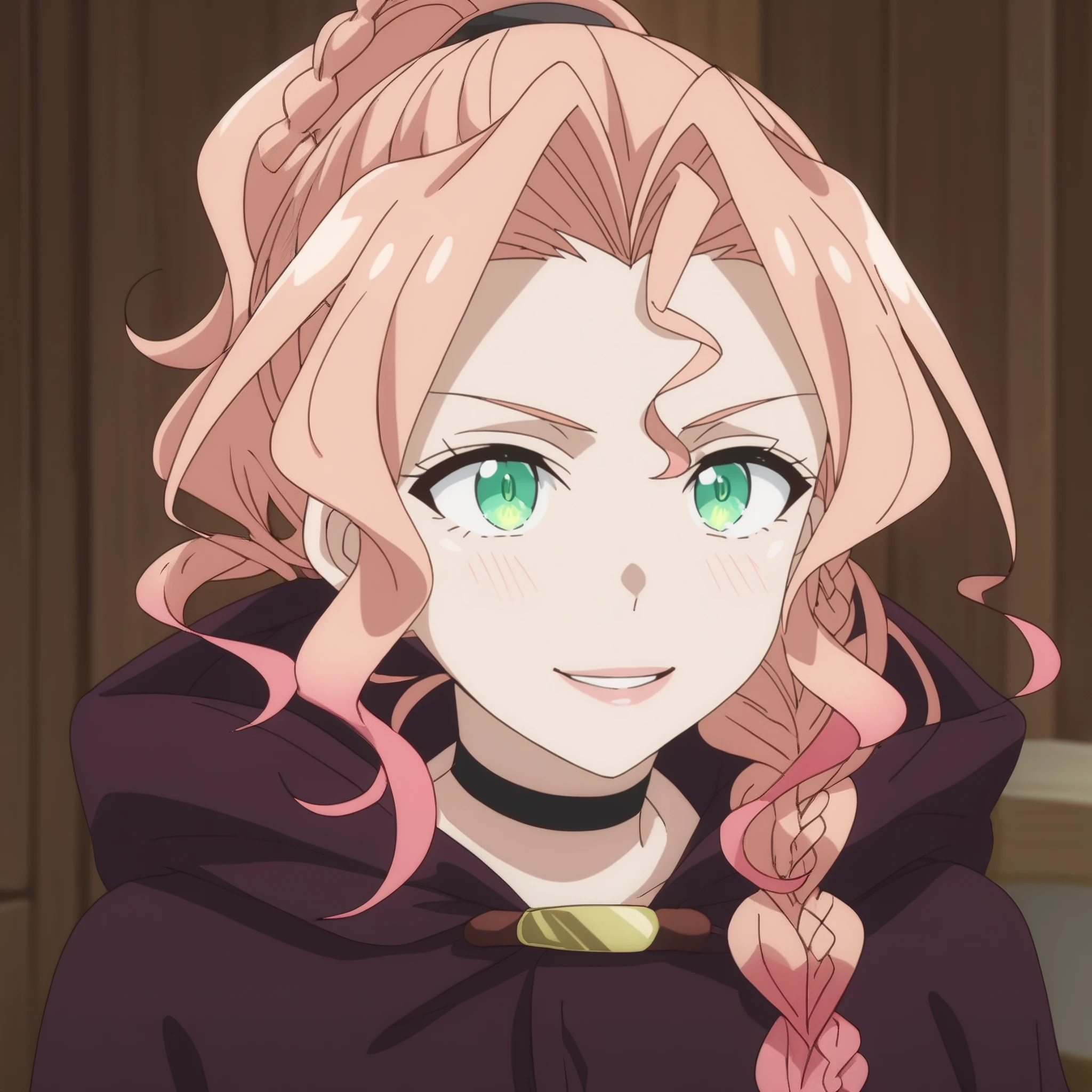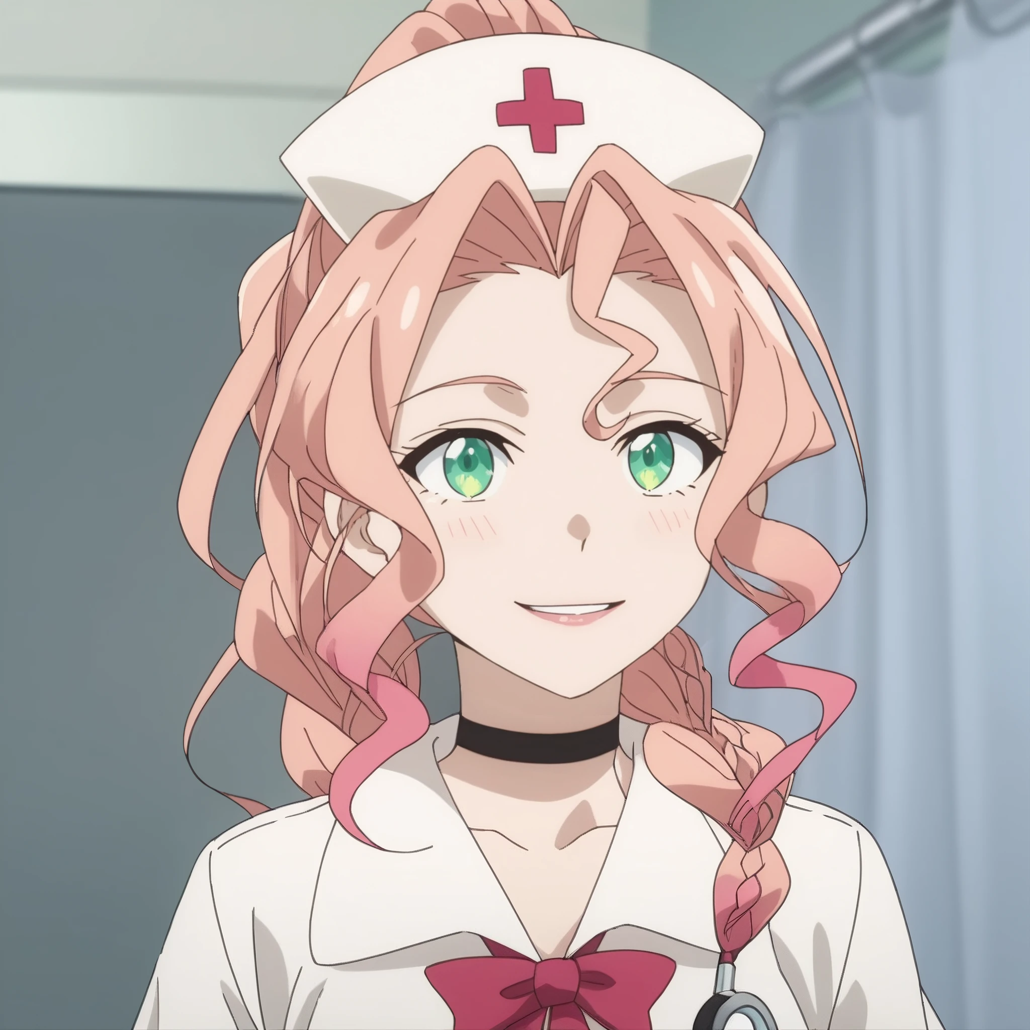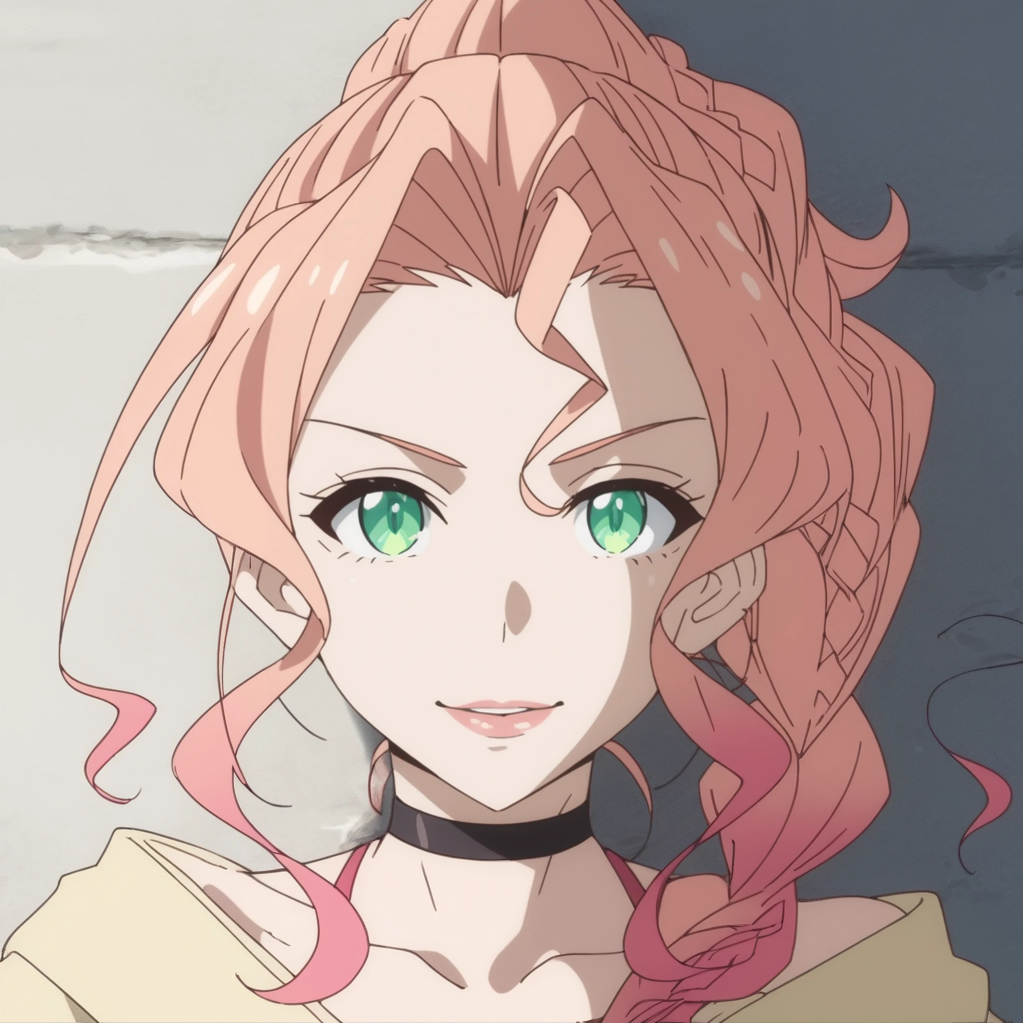 SRALily, long hair, single braid, pink hair, black choker, multicolored hair, gradient hair, green eyes, high ponytail, hair intakes,
