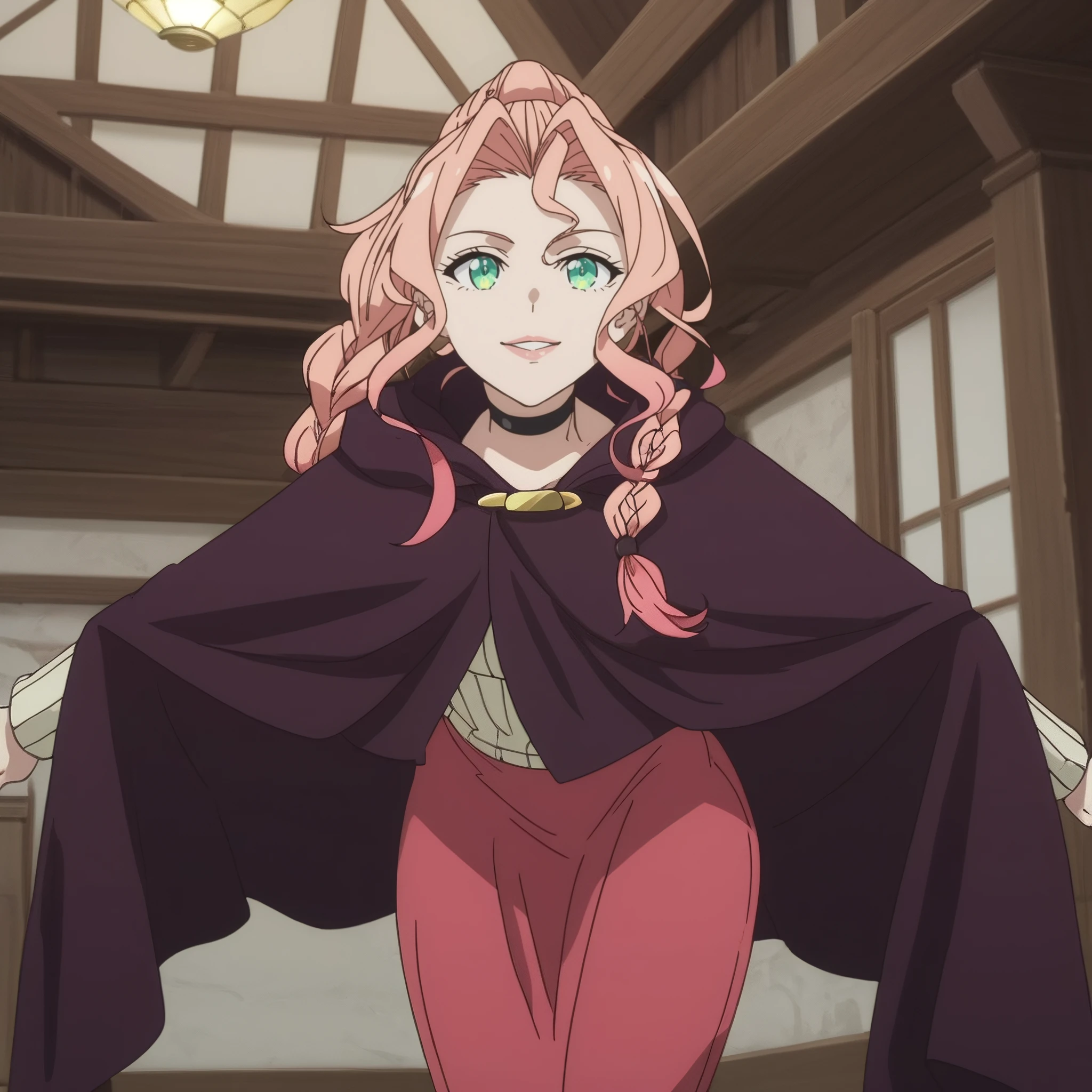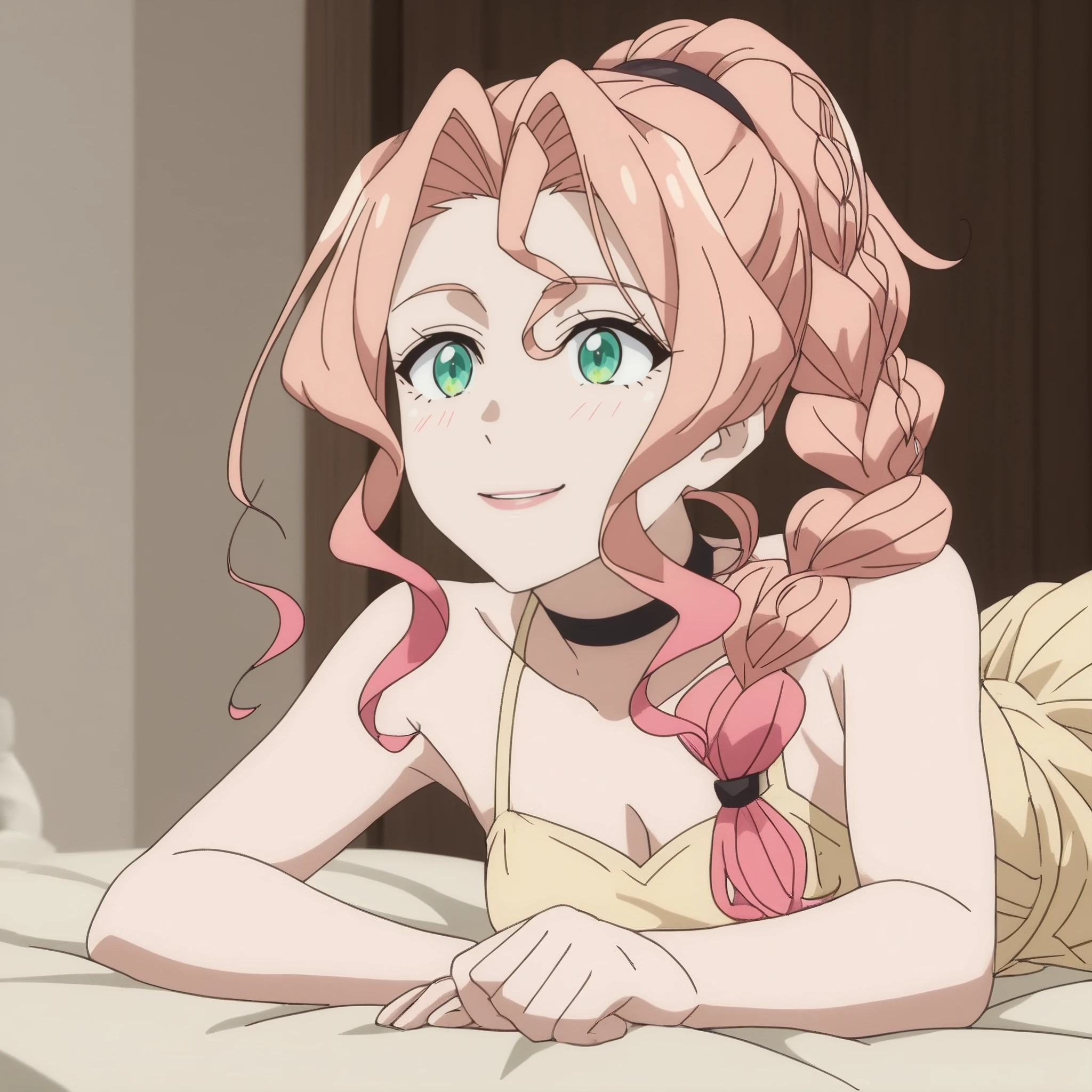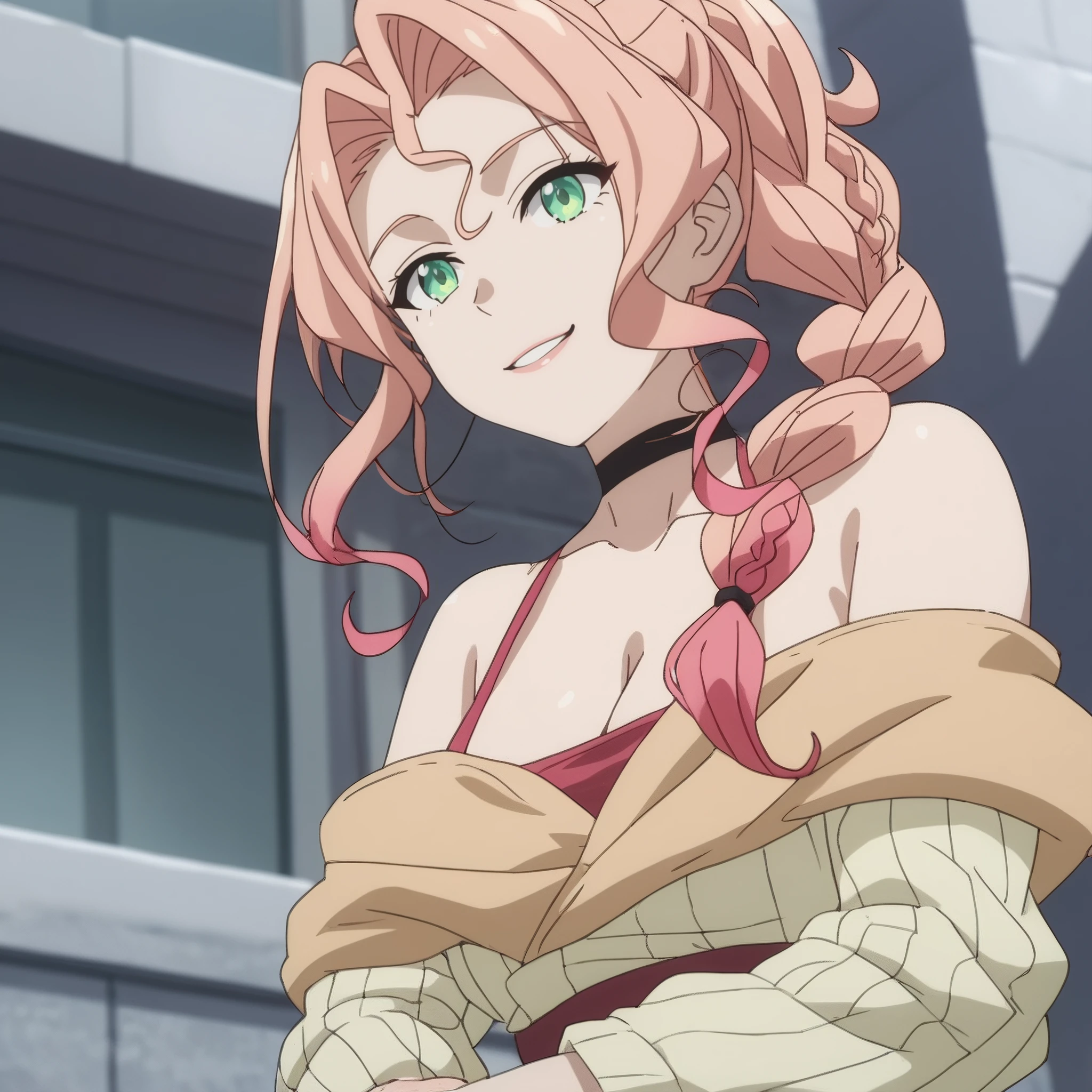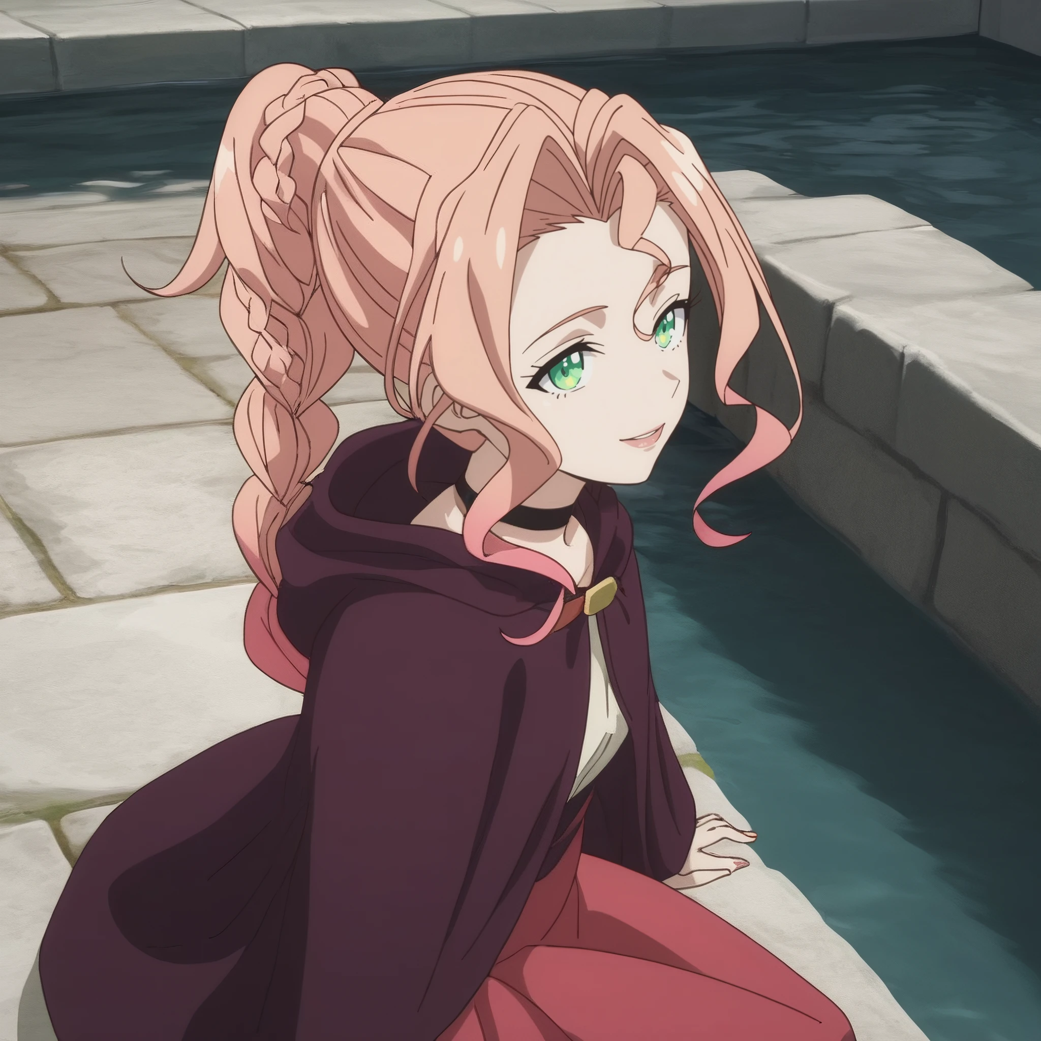 SRALily, long hair, single braid, pink hair, black choker, multicolored hair, gradient hair, green eyes, high ponytail, hair intakes,