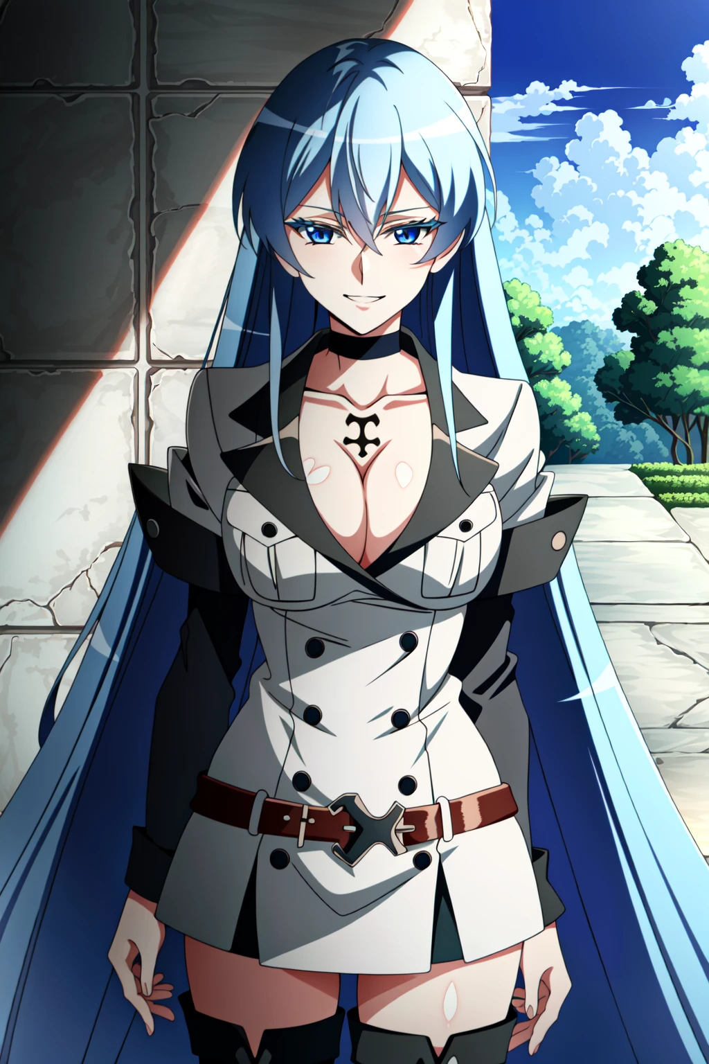 Esdeath, 1girl, solo, breasts, thigh boots, long hair, blue hair, blue eyes, thighhighs, hat, solo, very long hair, cleavage, boots, white footwear, large breasts, military uniform, military, uniform, choker, ice, peaked cap, sky, zettai ryouiki, cloud, white thighhighs