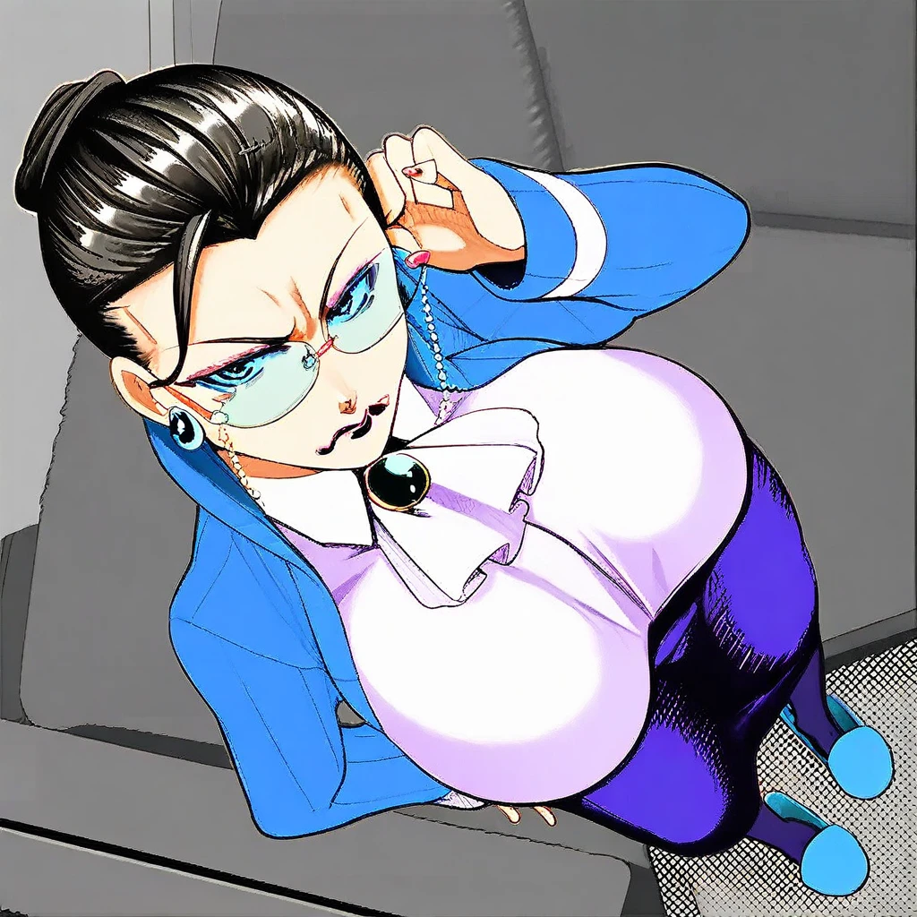 long sleeves, purple lips, lipstick, purple skirt, jewelry, stud earrings, wing collar, hair bun, sleeve cuffs, purple pantyhose, white shirt, brooch, long skirt, pencil skirt, blue jacket, ascot, collared shirt, hooded jacket, updo