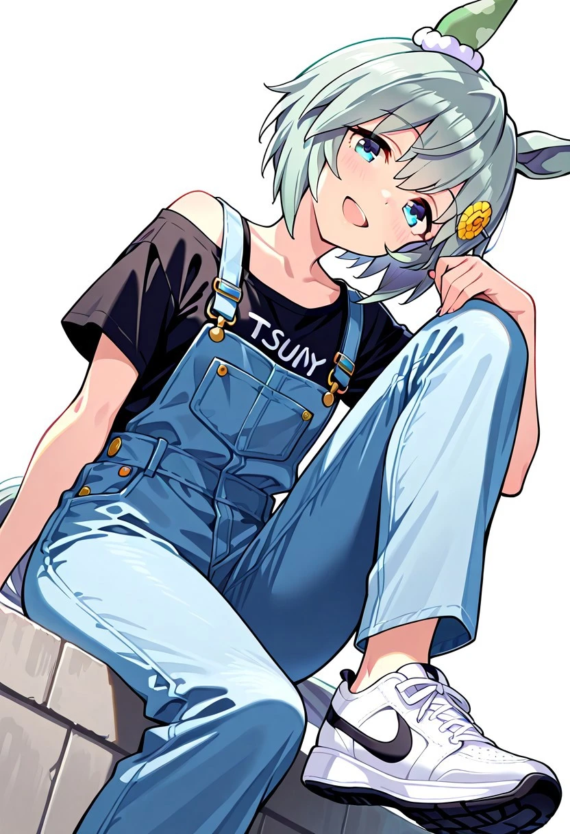 casual,single ear cover,hair flower,hairclip,black shirt,t-shirt,clothes writing,one-side off shoulder,short sleeves,overalls,suspenders pants,white footwear,sneakers
