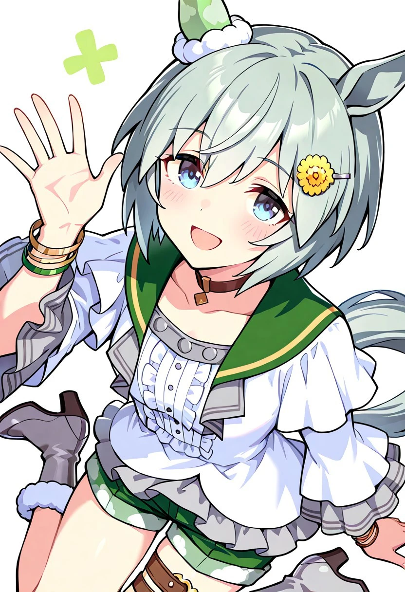 horse tail,horse ears,horse girl,light green hair,short hair,hair between eyes,blue eyes,grey eyes,green eyes,bangs