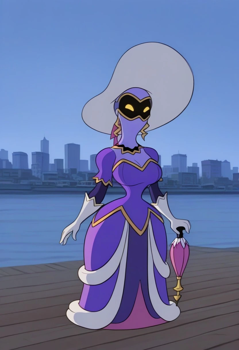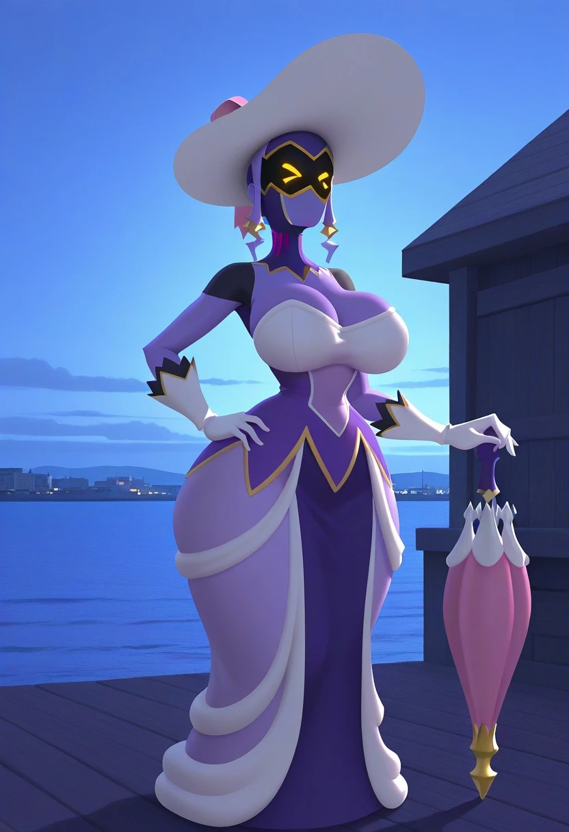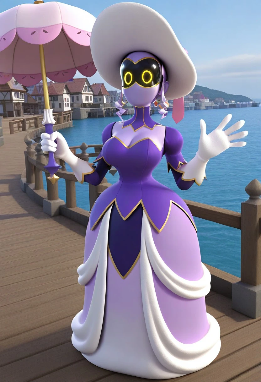 Parasol Beauty, purple skin, black visor, glowing yellow eyes, nose, no mouth, white hat, elegant purple dress, long white and purple skirt, white gloves, holding parasol
