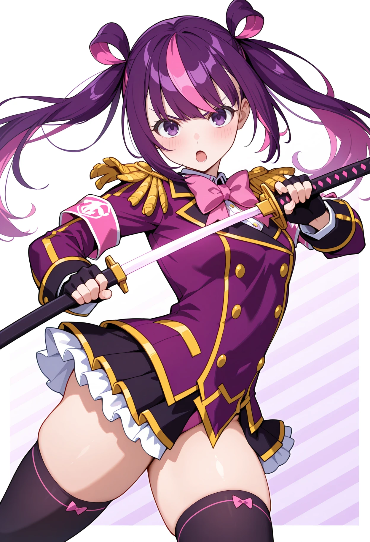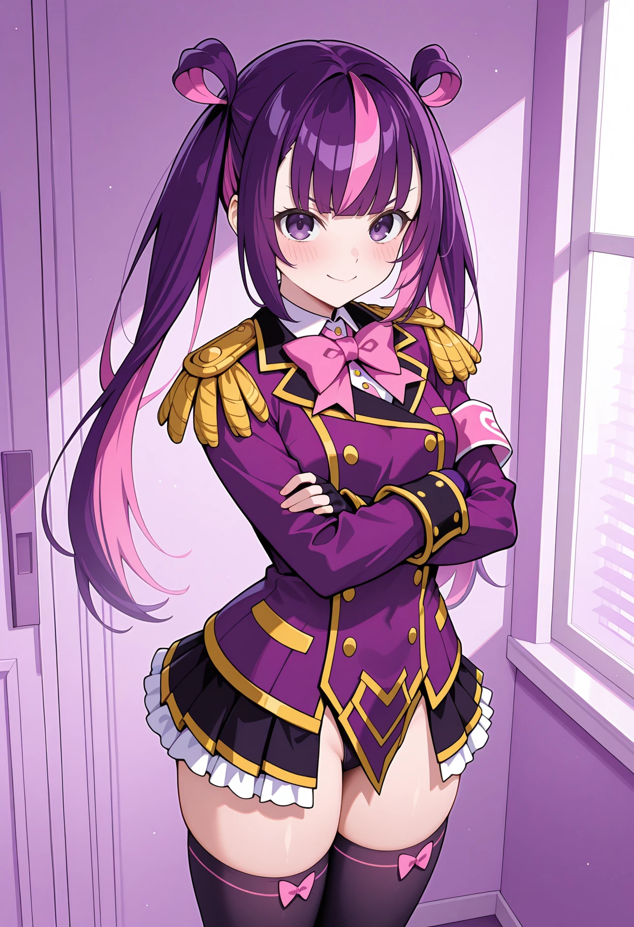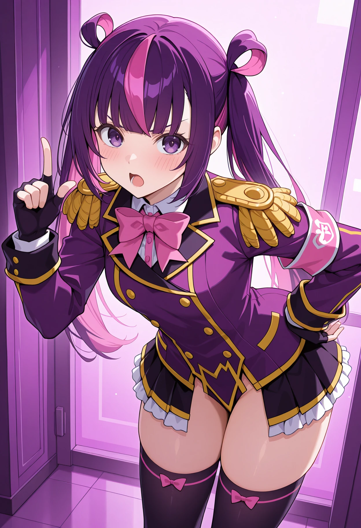 purple jacket, twintails, epaulettes, pink bow, double-breasted, gold trim, armband, fingerless gloves, black skirt, pleated skirt, frilled skirt, half-skirt, miniskirt, black thighhighs, showgirl skirt,