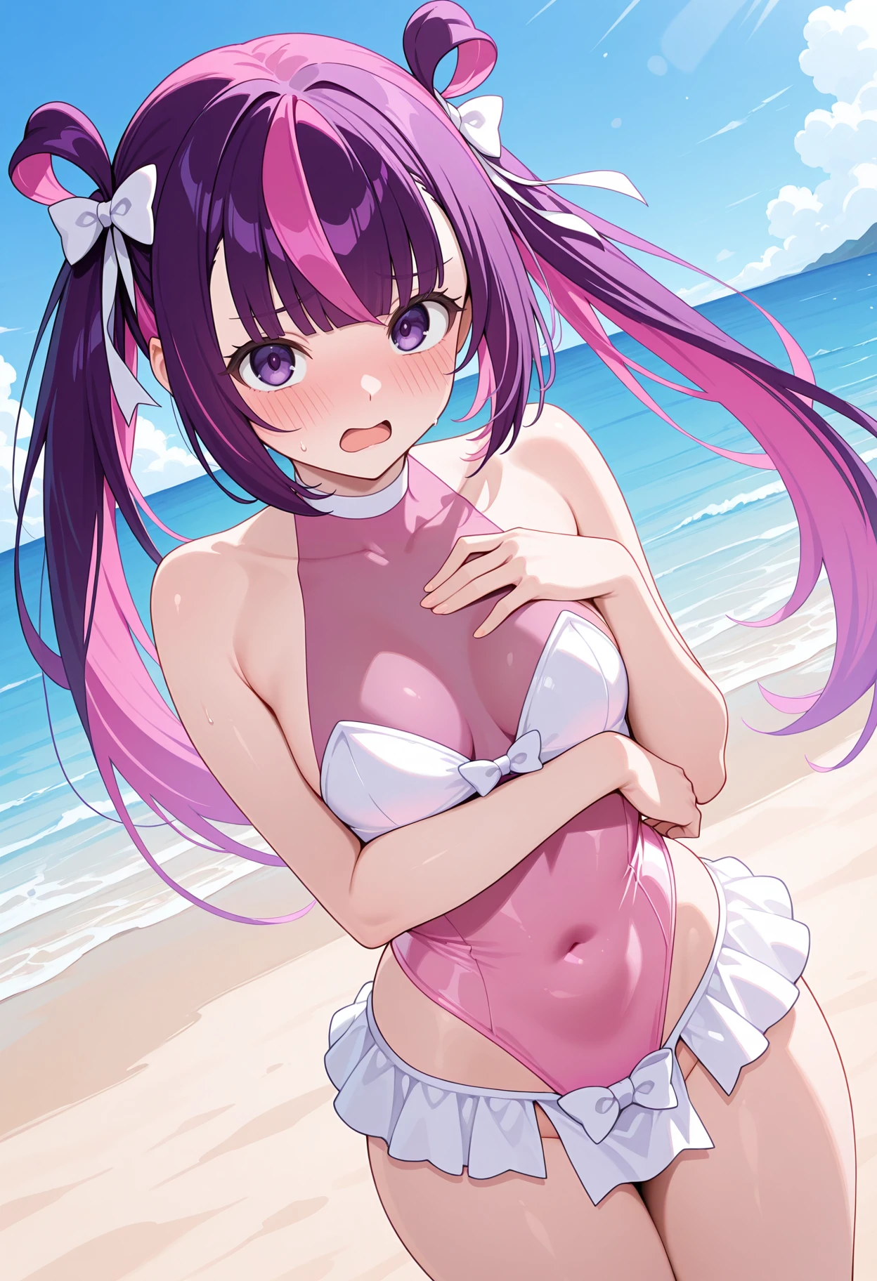 kmfgmus, long hair, purple hair, pink hair, streaked hair, hair ring, purple eyes, blunt bangs, small breasts,