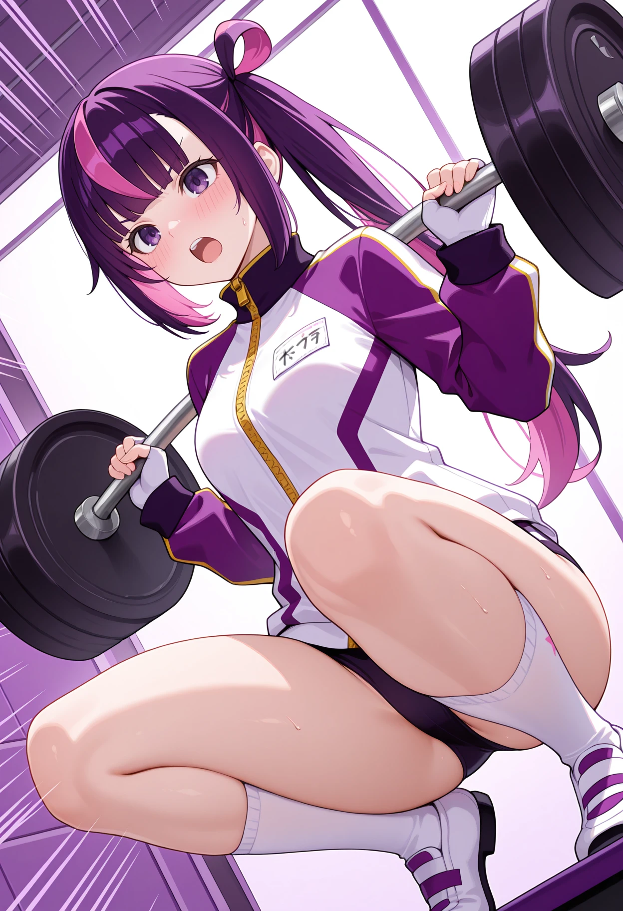 track jacket, single hair ring, side ponytail, two-tone jacket, white jacket, zipper, purple jacket, name tag, black buruma, fingerless gloves,