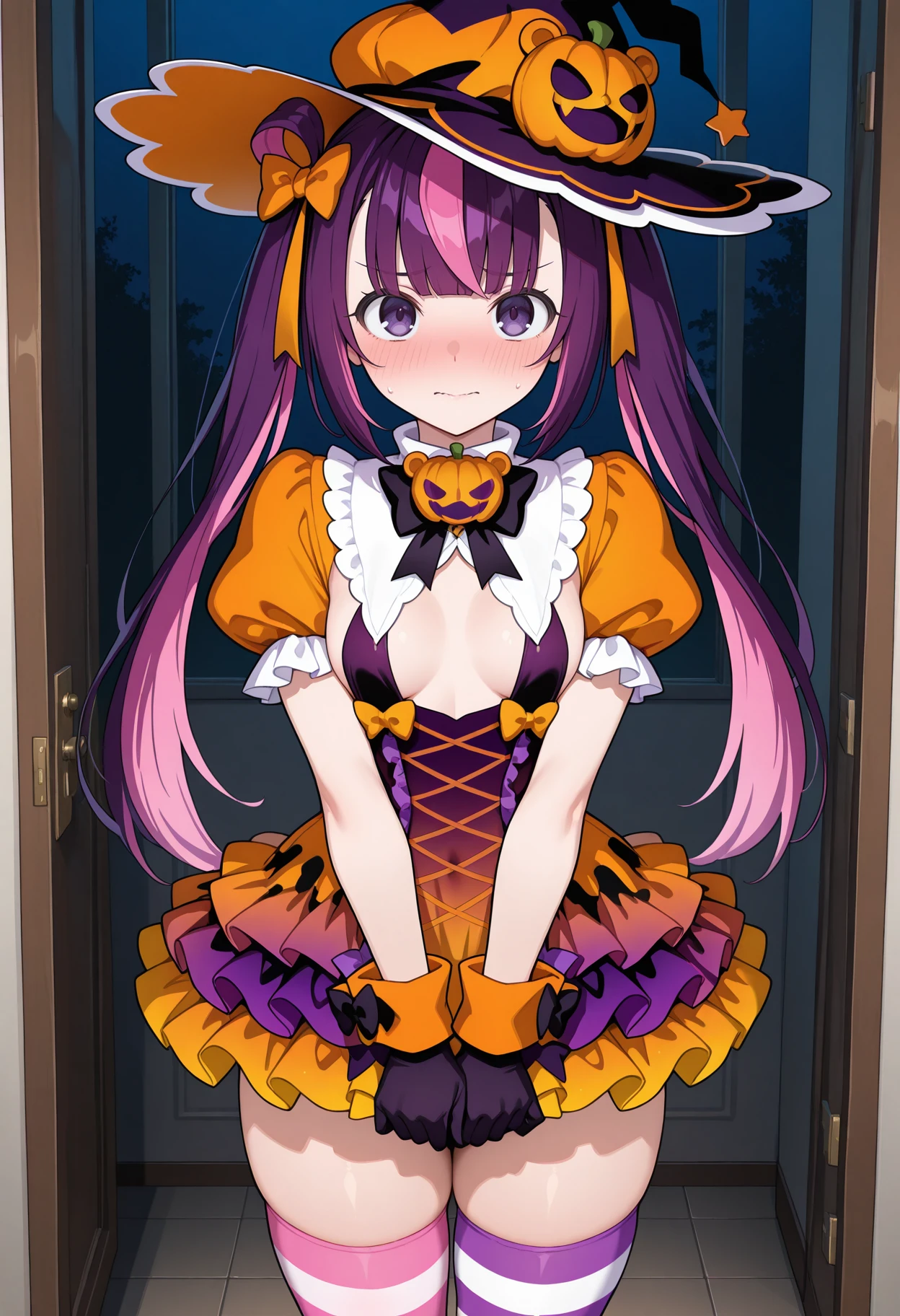 halloween costume, twintails, witch hat, hair bow, jack-o'-lantern ornament, bow, puffy short sleeves, orange sleeves, multicolored dress, white collar, center opening, frills, multiple bows, multicolored dress, gradient dress, layered dress, orange dress, purple dress, cross-laced clothes, striped thighhighs, mismatched legwear, pink thighhighs, purple thighhighs, gloves, orange wrist cuffs,
