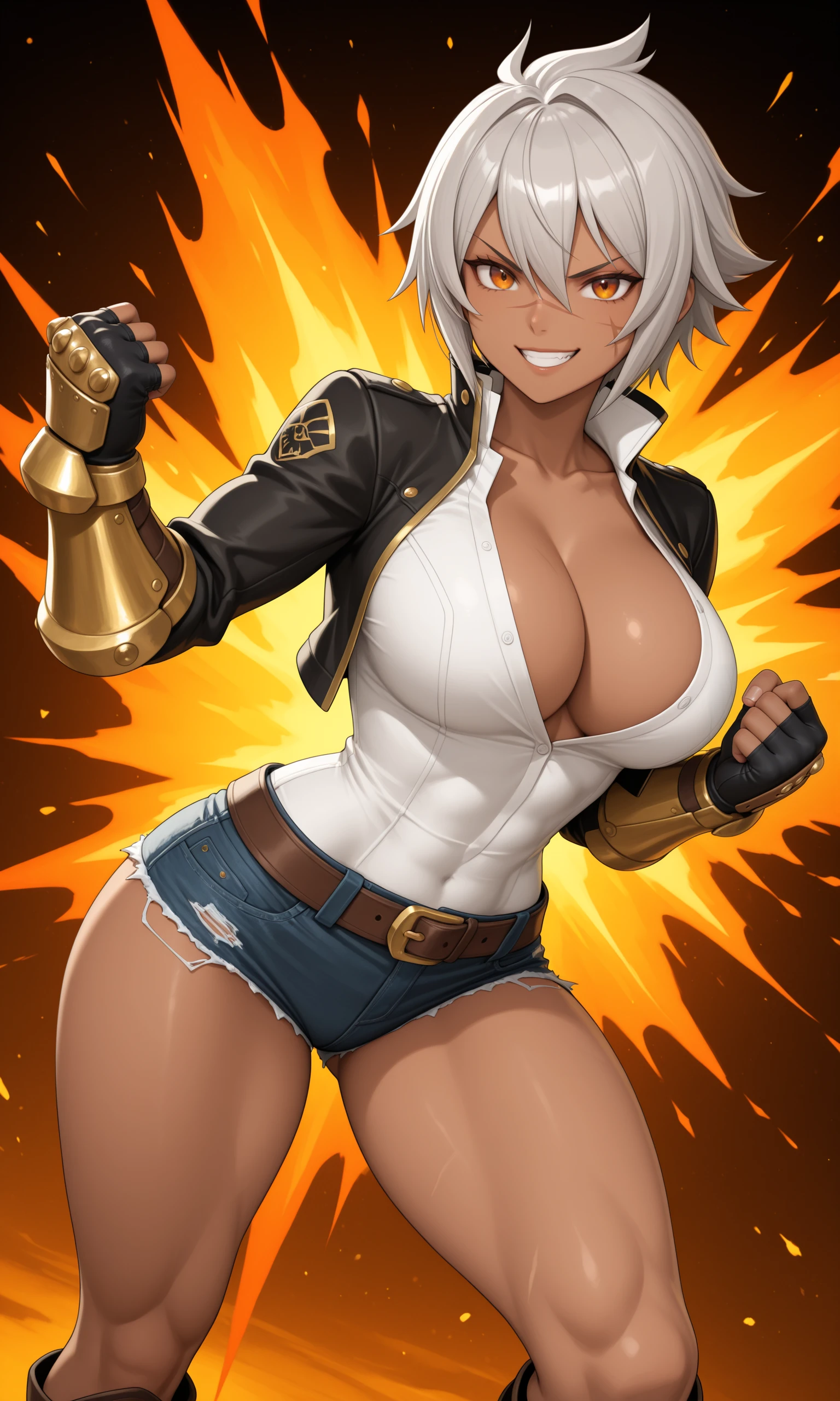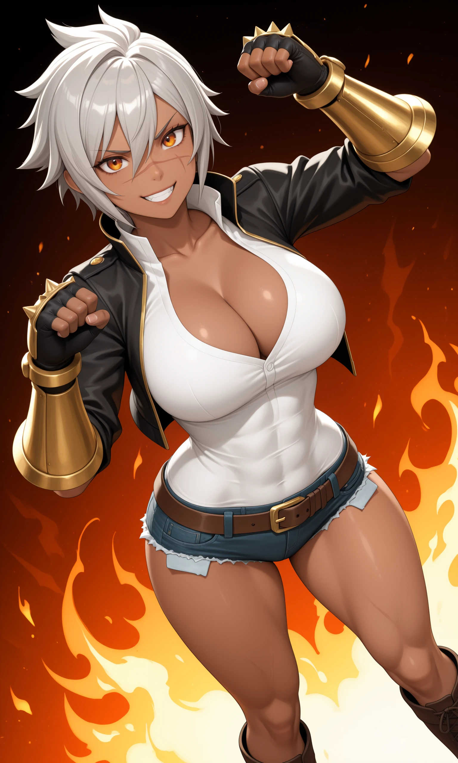 Main Prompt: 1girl, solo, mature female, dark-skinned female, toned, short hair, spiky hair, grey hair, hair between eyes, amber eyes, scar on face, large breasts, slim waist, wide hips,