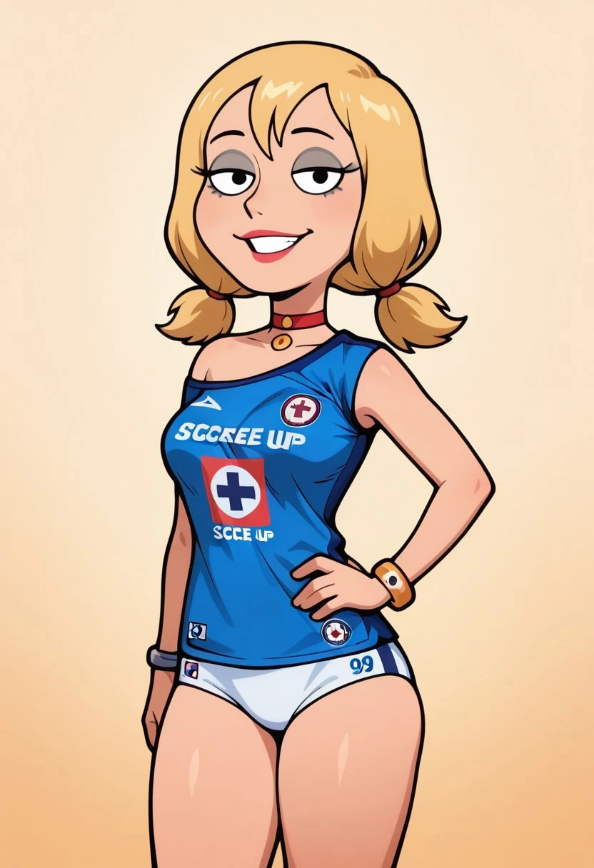 soccer uniform, blue shirt, sports jersey, white briefs, red V shaped bottom, thighs clothes