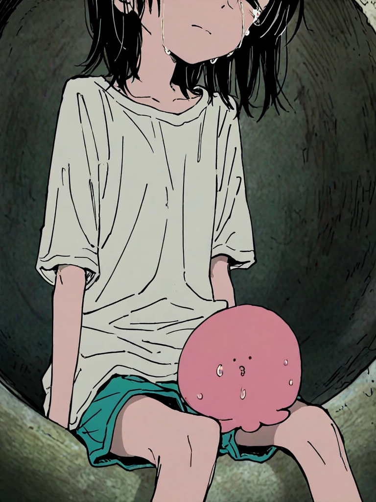 1girl, solo, white shirt, blue shorts, short hair, animal hug, eyes out of frame,