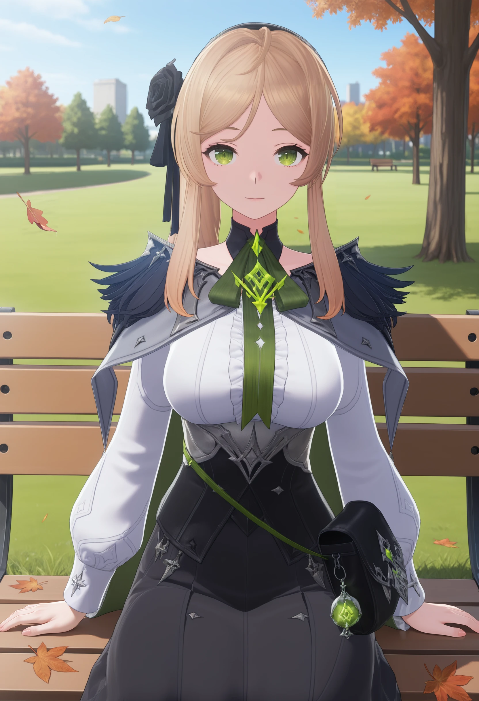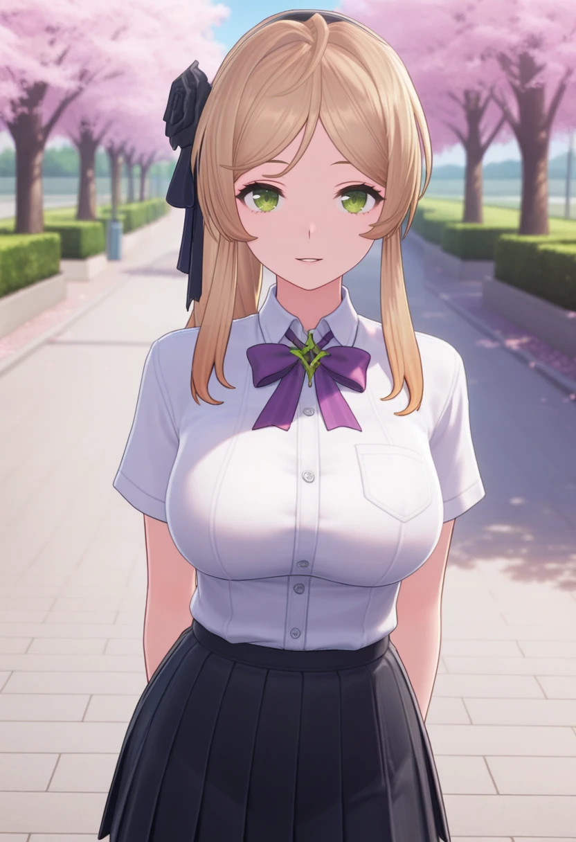 green eyes, blonde hair, long hair, side ponytail, black hairband, hair flower, hair ribbon