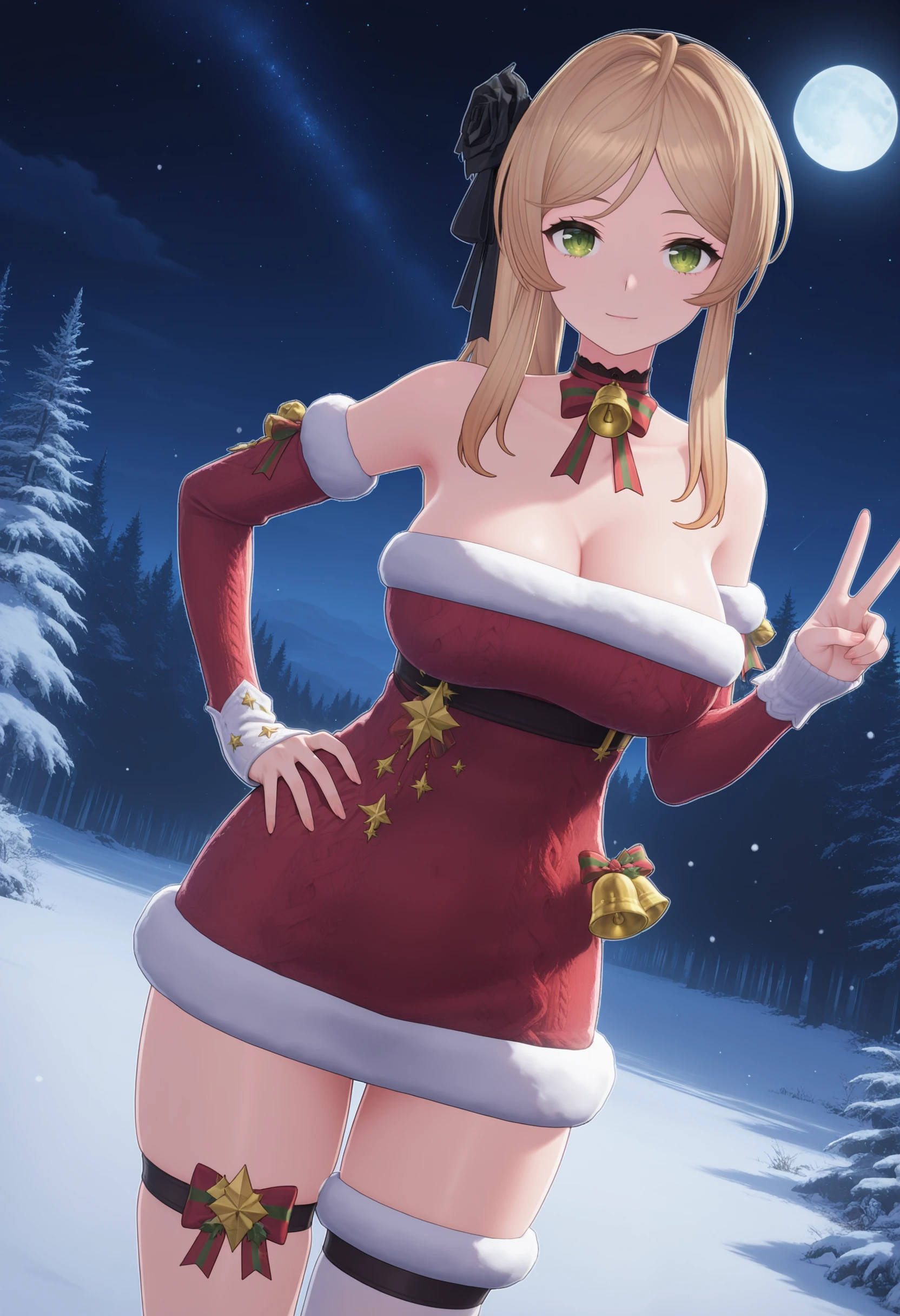 2 fur trim,red bowtie,striped bow,neck bell,bare shoulders,strapless dress,red dress,sweater dress,short dress,backless dress,detached sleeves,single thighhigh,white thighhighs,thigh belt,thigh strap,official alternate costume
