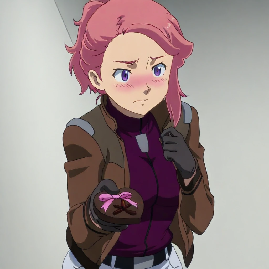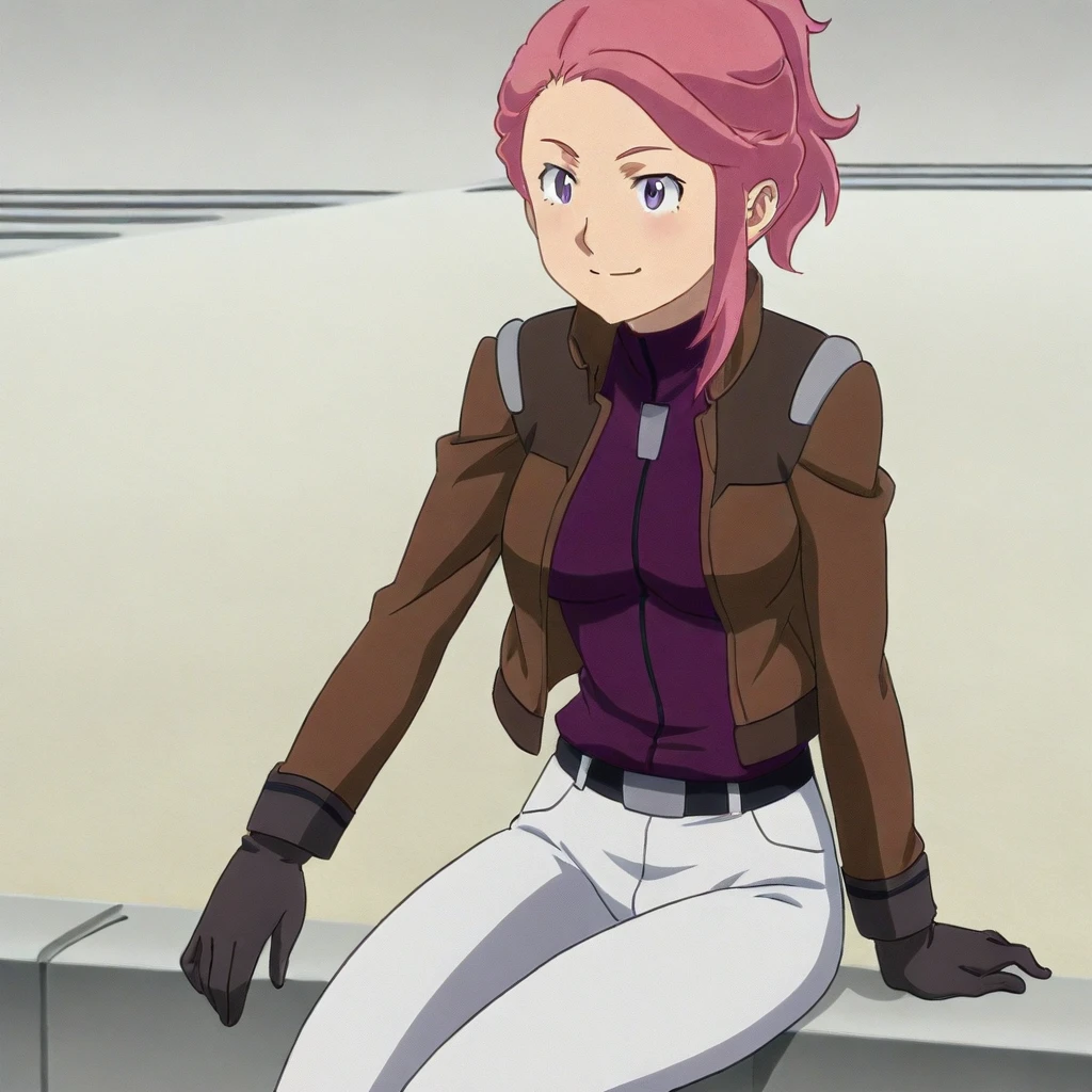 shanalua mullen \(gundam\), dark pink hair, medium hair, asymmetrical hair, short ponytail, purple eyes, brown jacket, , purple undershirt, zipper, belt, pants, gloves, heels, large breasts, 1girl, solo