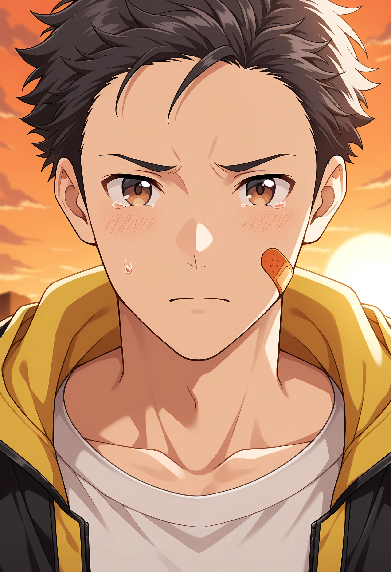 k1mur4_ry, black hair, brown eyes, bandaid, bandaid on face